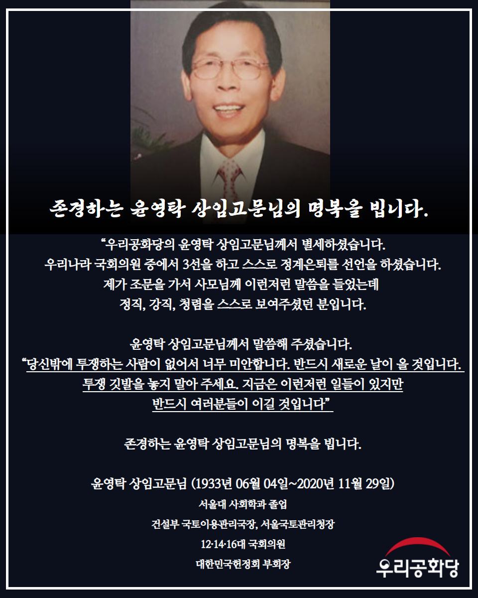 ´ëÇѹα¹ Á¤Ä¡ÀÎÀ¸·Î¼ Á¤Á÷, °Á÷, û·ÅÀÇ ±æÀ» °¡½Å À±¿µÅ¹ »óÀÓ°í¹®´ÔÀÇ ¸íº¹À» º÷´Ï´Ù.