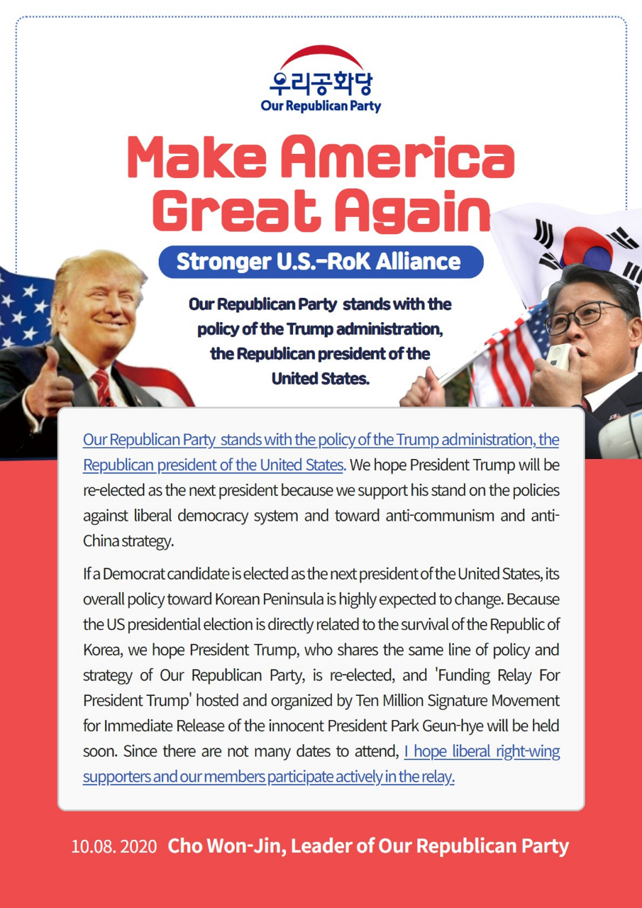 If a Democrat candidate is elected as the next president of the United States, its overall policy toward Korean Peninsula is highly expected to change. Because the US presidential election is directly related to the survival of the Republic of Korea, we hope President Trump, who shares the same line of policy and strategy with Our Republican Party, is re-elected, and 'Funding Relay For President Trump' hosted and organized by Ten Million Signature Movement for Immediate Release of the innocent President Park Geun-hye will be held soon. Since there are not many dates to attend, I hope liberal right-wing supporters and our members participate actively in the relay.