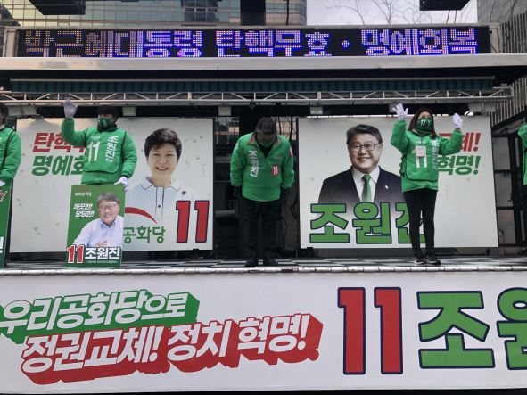 ¿ì¸®°øÈ´ç Á¶¿øÁø ´ëÅë·É È帴 15ÀÏ(È) ´ëÅë·É¼±°Å ù À¯¼¼ÀÏÁ¤À¸·Î ¾ÆÄ§ 7½Ã 30ºÐ, ±¤È¹® »ç°Å¸® µ¿È¸é¼¼Á¡ ¾Õ¿¡¼ ¼¿ï½Ã¹Î²² Àλçµå¸®¸ç "À̹ø ´ë¼±Àº ¹®ÀçÀÎ Ãкҵ¶À縦 Á¾½ÄÇϰí ÀÚÀ¯´ëÇѹα¹À» ´Ù½Ã ã´Â ¼±°Å"¶ó¸é¼ "±ú²ýÇÑ ´ëÇѹα¹, Á¤ÀÇ·Î¿î ´ëÇѹα¹À» À§ÇØ ¡®Á¶¿øÁø¡¯À» ²À ¼±ÅÃÇØ´Þ¶ó"°í È£¼ÒÇß´Ù.