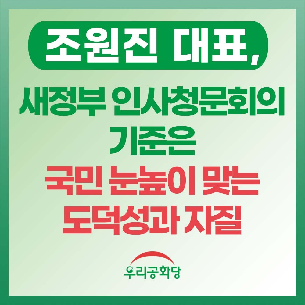 ¿ì¸®°øÈ´ç Á¶¿øÁø ´ëÇ¥ 29ÀÏ(±Ý) º¸µµÀڷḦ ³»°í "À±¼®¿ »õÁ¤ºÎ°¡ ºÒÅë ¹®ÀçÀÎ Á¤±ÇÀÇ ³»·Î³²ºÒ°ú ´Ù¸£´Ù´Â °ÍÀ» ±¹¹Î²² º¸¿©ÁÙ ¼ö ÀÖ´Â Àλçû¹®È¸°¡ µÇ¾î¾ß ÇÒ °Í"À̶ó¸é¼ "±¹°¡°ü µî Á¤Ã¼¼ºÀÌ È®½ÇÇÑÁö, µµ´öÀûÀ¸·Î ±ú²ýÇÑÁö, ±¹¹«À§¿øÀ¸·Î¼ÀÇ ÀÚÁúÀÌ ÀÖ´ÂÁö µî ³ô¾ÆÁø ±¹¹ÎÀÇ ´«³ôÀÌ¿¡ ¹Ýµå½Ã ¸ÂÃç¾ß ÇÑ´Ù"°í ¸»Çß´Ù.
