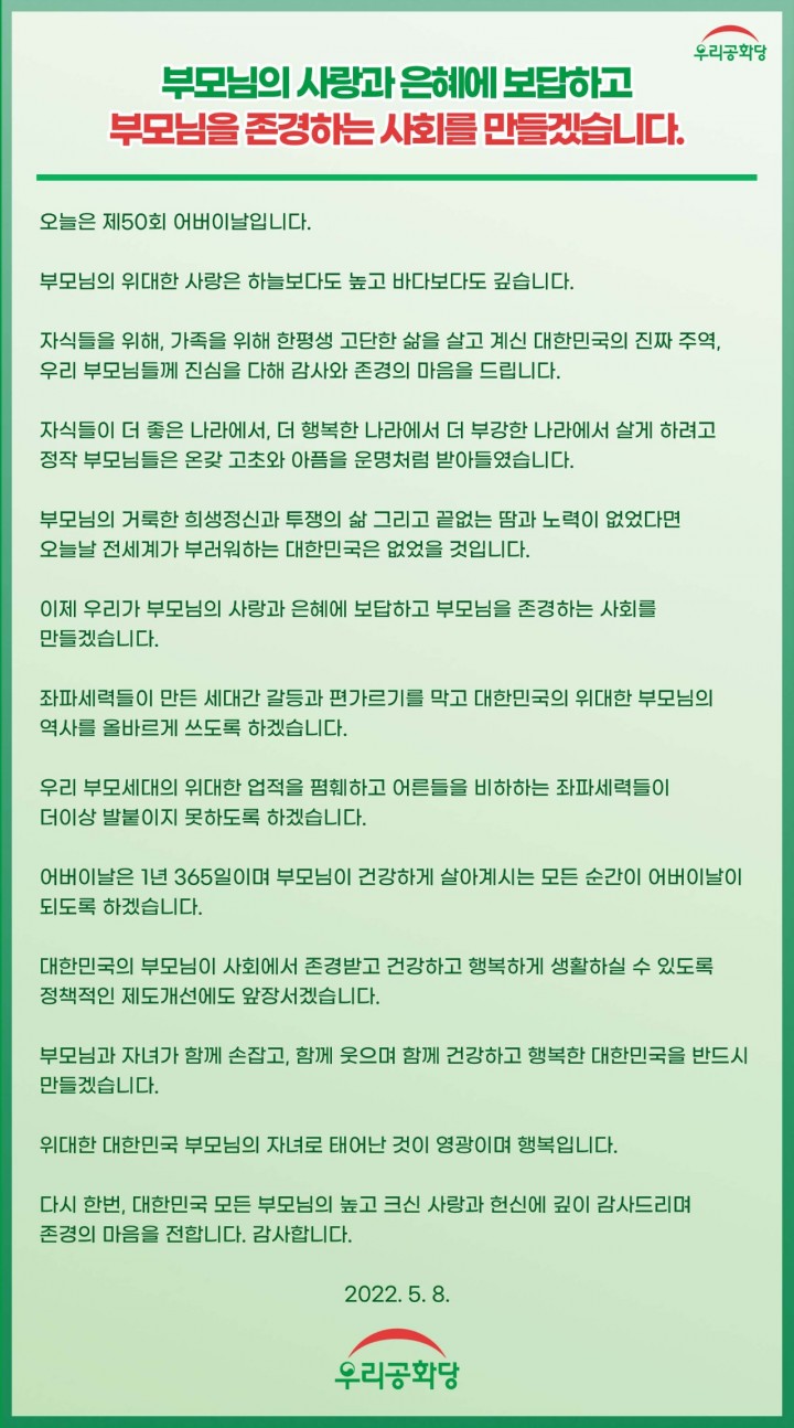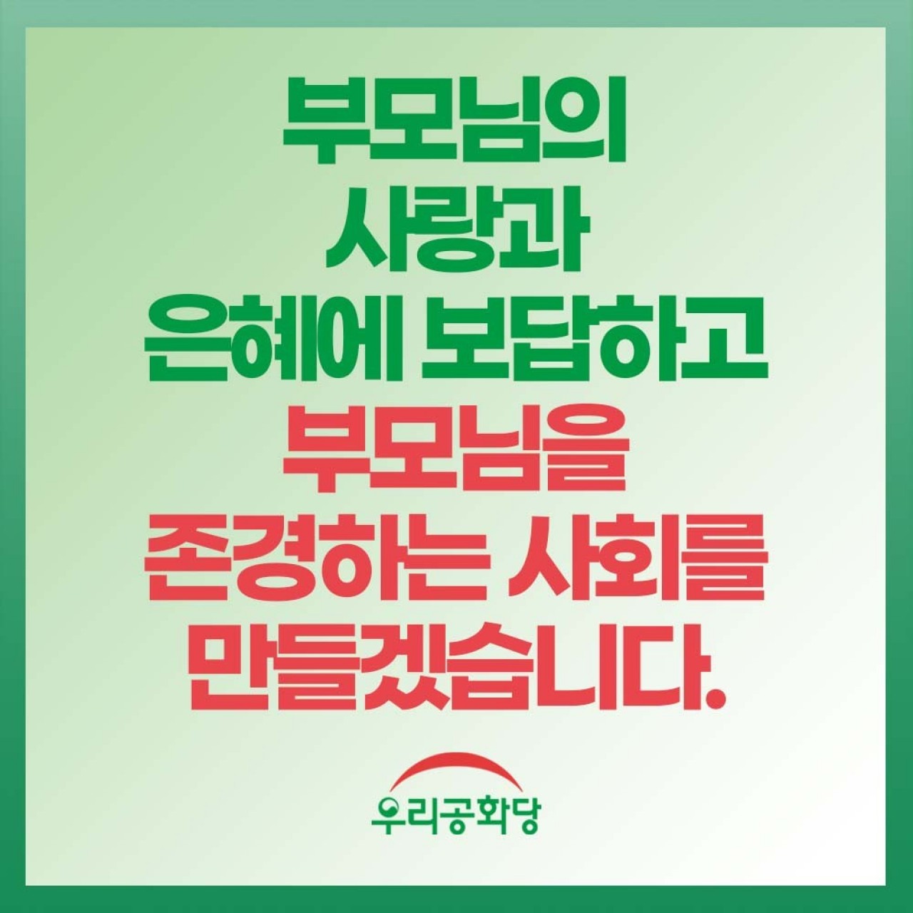 ÀÌÁ¦ ¿ì¸®°¡ ºÎ¸ð´ÔÀÇ »ç¶û°ú ÀºÇý¿¡ º¸´äÇÏ°í ºÎ¸ð´ÔÀ» Á¸°æÇÏ´Â »çȸ¸¦ ¸¸µé°Ú½À´Ï´Ù.