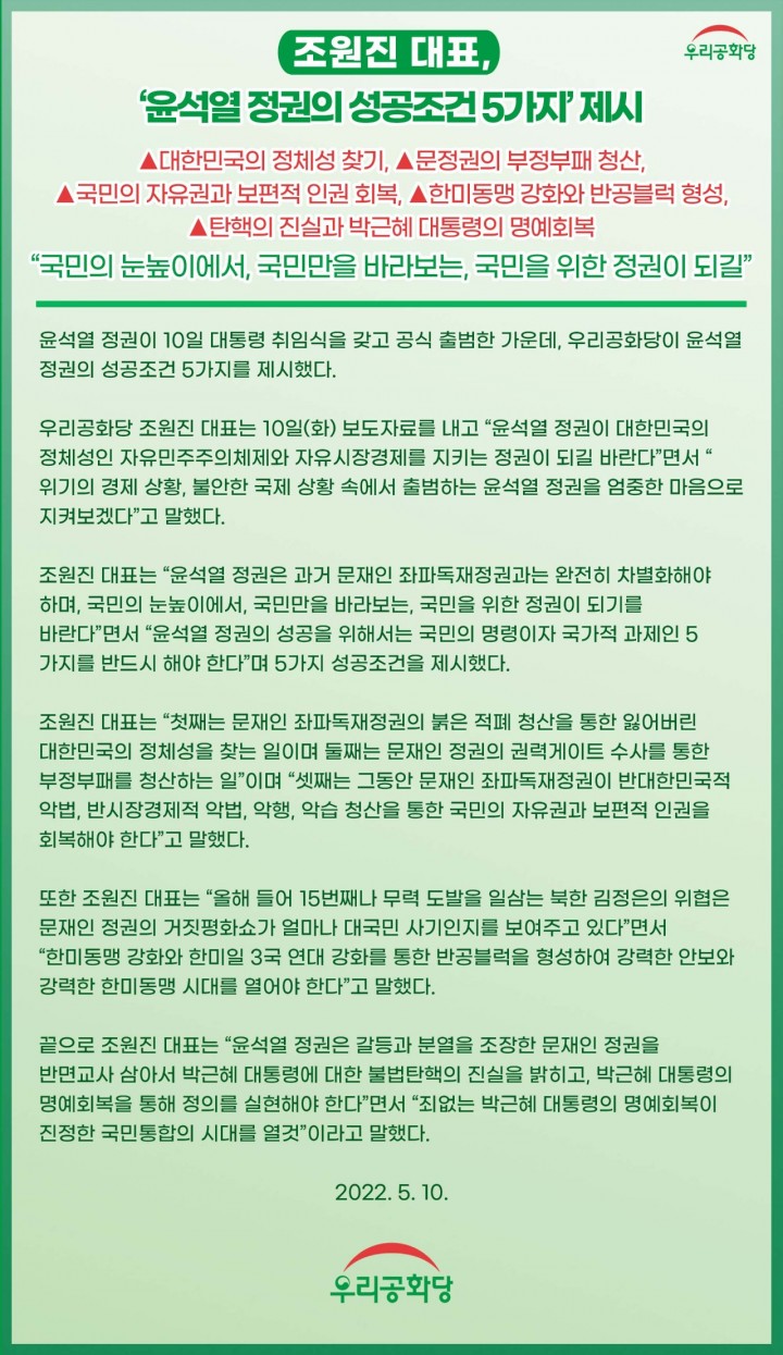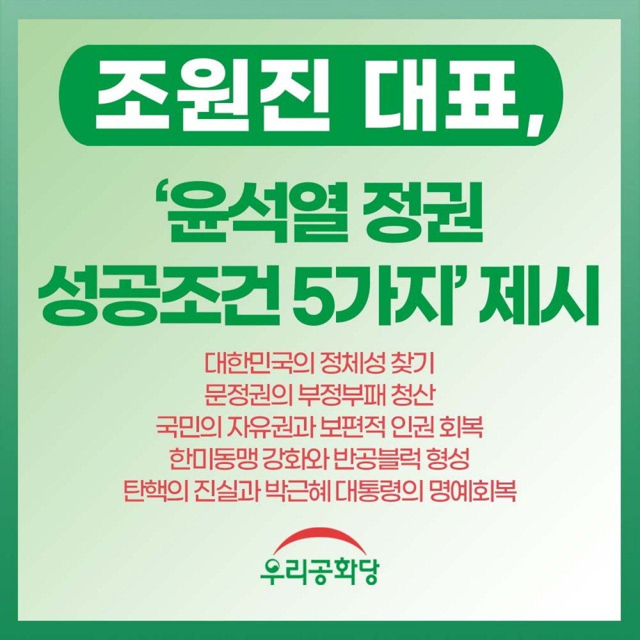 Á¶¿øÁø ´ëÇ¥´Â "À±¼®¿ Á¤±ÇÀº °ú°Å ¹®ÀçÀÎ ÁÂÆÄµ¶ÀçÁ¤±Ç°ú´Â ¿ÏÀüÈ÷ Â÷º°ÈÇØ¾ß Çϸç, ±¹¹ÎÀÇ ´«³ôÀÌ¿¡¼, ±¹¹Î¸¸À» ¹Ù¶óº¸´Â, ±¹¹ÎÀ» À§ÇÑ Á¤±ÇÀÌ µÇ±â¸¦ ¹Ù¶õ´Ù"¸é¼ "À±¼®¿ Á¤±ÇÀÇ ¼º°øÀ» À§Çؼ´Â ±¹¹ÎÀÇ ¸í·ÉÀÌÀÚ ±¹°¡Àû °úÁ¦ÀÎ 5°¡Áö¸¦ ¹Ýµå½Ã ÇØ¾ß ÇÑ´Ù"¸ç 5°¡Áö ¼º°øÁ¶°ÇÀ» Á¦½ÃÇß´Ù.