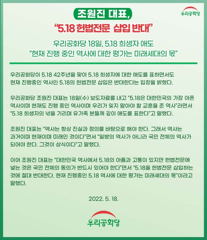 ¿ì¸®°øÈ´ç Á¶¿øÁø ´ëÇ¥´Â 18ÀÏ(¼ö) º¸µµÀڷḦ ³»°í "5.18Àº ´ëÇѹα¹ÀÇ °¡Àå ¾ÆÇ ¿ª»çÀ̸ç ÇöÀçµµ ÁøÇà ÁßÀÎ ¿ª»çÀÌ¸ç ¿ì¸®°¡ ÀØÁö ¸»¾Æ¾ß ÇÒ ±³ÈÆÀ» ÁØ ¿ª»ç"¶ó¸é¼ "5.18 Èñ»ýÀÚÀÇ ³ÌÀ» ±â¸®¸ç À¯°¡Á· ºÐµé²² ±íÀÌ ¾Öµµ¸¦ Ç¥ÇÑ´Ù"°í ¸»Çß´Ù.