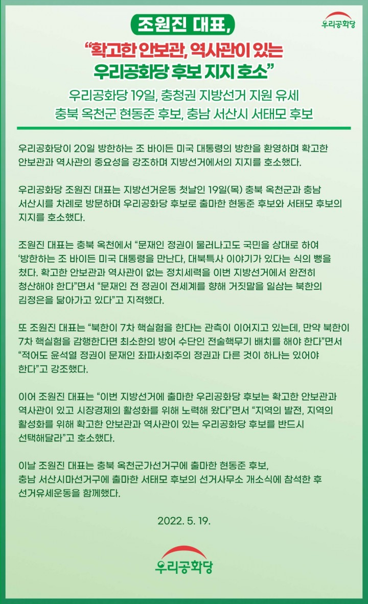 ¿ì¸®°øÈ´ç Á¶¿øÁø ´ëÇ¥´Â Áö¹æ¼±°Å¿îµ¿ ù³¯ÀÎ 19ÀÏ(¸ñ) ÃæºÏ ¿Áõ±º°ú Ãæ³² ¼»ê½Ã¸¦ Â÷·Ê·Î ¹æ¹®ÇÏ¸ç ¿ì¸®°øÈ´ç È帷ΠÃ⸶ÇÑ Çöµ¿ÁØ Èĺ¸¿Í ¼Å¸ð Èĺ¸ÀÇ ÁöÁö¸¦ È£¼ÒÇß´Ù.