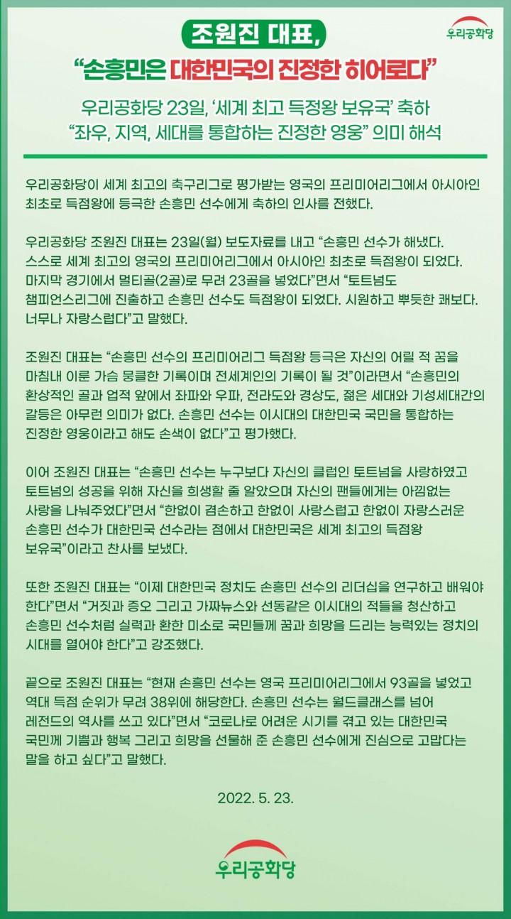 Á¶¿øÁø ´ëÇ¥´Â "¼ÕÈï¹Î ¼±¼öÀÇ ÇÁ¸®¹Ì¾î¸®±× µæÁ¡¿Õ µî±ØÀº ÀÚ½ÅÀÇ ¾î¸± Àû ²ÞÀ» ¸¶Ä§³» ÀÌ·é °¡½¿ ¹¶Å¬ÇÑ ±â·ÏÀ̸ç Àü¼¼°èÀÎÀÇ ±â·ÏÀÌ µÉ °Í"À̶ó¸é¼ "¼ÕÈï¹ÎÀÇ È¯»óÀûÀÎ °ñ°ú ¾÷Àû ¾Õ¿¡¼ ÁÂÆÄ¿Í ¿ìÆÄ, Àü¶óµµ¿Í °æ»óµµ, ÀþÀº ¼¼´ë¿Í ±â¼º¼¼´ë°£ÀÇ °¥µîÀº ¾Æ¹«·± Àǹ̰¡ ¾ø´Ù. ¼ÕÈï¹Î ¼±¼ö´Â À̽ôëÀÇ ´ëÇѹα¹ ±¹¹ÎÀ» ÅëÇÕÇÏ´Â ÁøÁ¤ÇÑ ¿µ¿õÀ̶ó°í ÇØµµ ¼Õ»öÀÌ ¾ø´Ù"°í Æò°¡Çß´Ù.