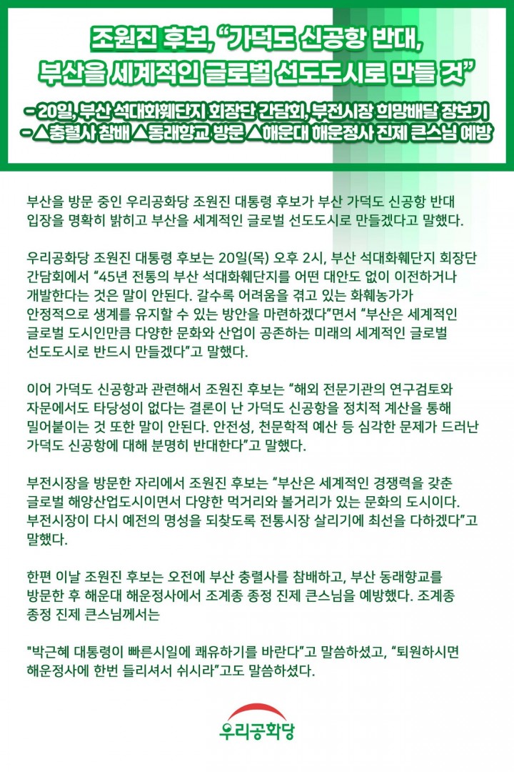 ¿ì¸®°øÈ´ç Á¶¿øÁø ´ëÅë·É È帴 20ÀÏ(¸ñ) ¿ÀÈÄ 2½Ã, ºÎ»ê ¼®´ëÈÈÑ´ÜÁö ȸÀå´Ü °£´ãȸ¿¡¼ "45³â ÀüÅëÀÇ ºÎ»ê ¼®´ëÈÈÑ´ÜÁö¸¦ ¾î¶² ´ë¾Èµµ ¾øÀÌ ÀÌÀüÇϰųª °³¹ßÇÑ´Ù´Â °ÍÀº ¸»ÀÌ ¾ÈµÈ´Ù. °¥¼ö·Ï ¾î·Á¿òÀ» °Þ°í ÀÖ´Â ÈÈѳ󰡰¡ ¾ÈÁ¤ÀûÀ¸·Î »ý°è¸¦ À¯ÁöÇÒ ¼ö ÀÖ´Â ¹æ¾ÈÀ» ¸¶·ÃÇϰڴÙ"¸é¼ "ºÎ»êÀº ¼¼°èÀûÀÎ ±Û·Î¹ú µµ½ÃÀθ¸Å ´Ù¾çÇÑ ¹®È¿Í »ê¾÷ÀÌ °øÁ¸ÇÏ´Â ¹Ì·¡ÀÇ ¼¼°èÀûÀÎ ±Û·Î¹ú ¼±µµµµ½Ã·Î ¹Ýµå½Ã ¸¸µé°Ú´Ù"°í ¸»Çß´Ù.