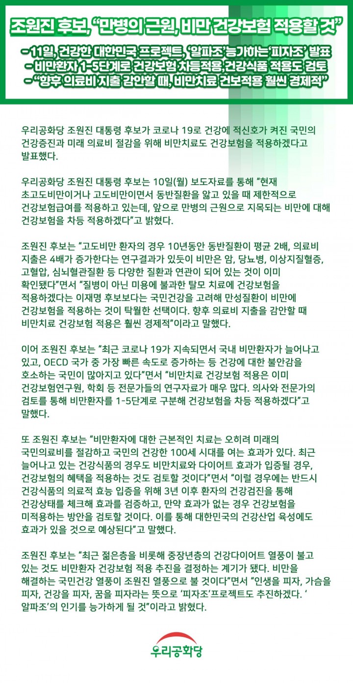 Á¶¿øÁø Èĺ¸, "¸¸º´ÀÇ ±Ù¿ø, ºñ¸¸ °Ç°º¸Çè Àû¿ëÇÒ °Í"