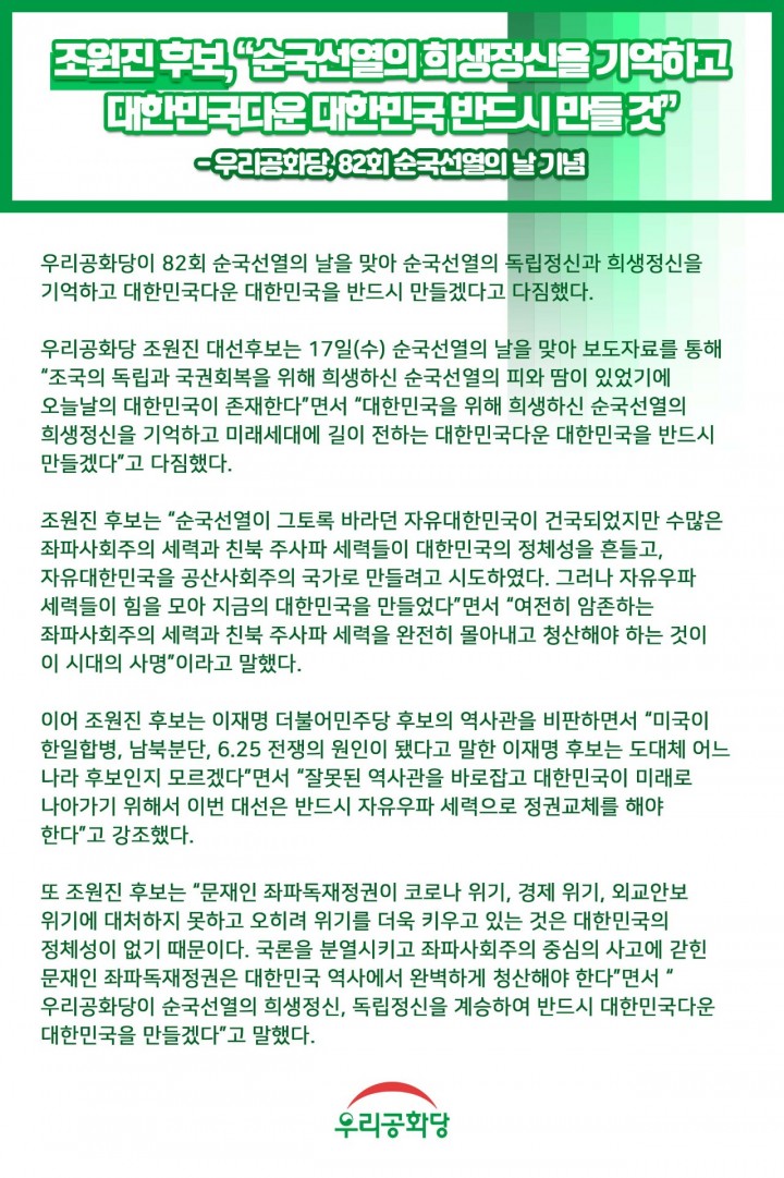 ¿ì¸®°øÈ´ç Á¶¿øÁø ´ë¼±È帴 17ÀÏ(¼ö) ¼ø±¹¼±¿ÀÇ ³¯À» ¸Â¾Æ º¸µµÀڷḦ ÅëÇØ "Á¶±¹ÀÇ µ¶¸³°ú ±¹±Çȸº¹À» À§ÇØ Èñ»ýÇϽмø±¹¼±¿ÀÇ ÇÇ¿Í ¶¡ÀÌ ÀÖ¾ú±â¿¡ ¿À´Ã³¯ÀÇ ´ëÇѹα¹ÀÌ Á¸ÀçÇÑ´Ù"¸é¼ "´ëÇѹα¹À» À§ÇØ Èñ»ýÇϽмø±¹¼±¿ÀÇ Èñ»ýÁ¤½ÅÀ» ±â¾ïÇÏ°í ¹Ì·¡¼¼´ë¿¡ ±æÀÌ ÀüÇÏ´Â ´ëÇѹα¹´Ù¿î ´ëÇѹα¹À» ¹Ýµå½Ã ¸¸µé°Ú´Ù"°í ´ÙÁüÇß´Ù.
