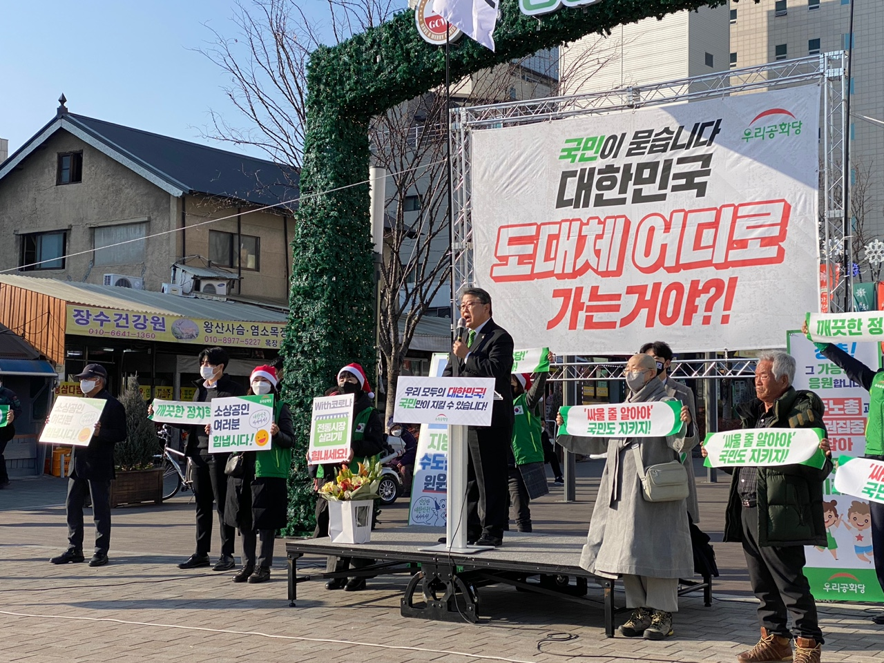 Á¶¿øÁø È帴 Áß¾Ó½ÃÀå¿¡¼ ¼Ò»ó°øÀΰúÀÇ °£´ãȸ ÀÌÈÄ º°µµÀÇ ±âÀÚȸ°ßÀ» °®°í ¡ã±ú²ýÇÑ Á¤Ä¡Çõ¸í ¡ã¹Ú±ÙÇý ´ëÅë·ÉÀÇ Áï°¢ÀûÀÎ ¼®¹æ ¡ã³»°¢Á¦ °³Çå ¹Ý´ë ¡ã¹Ý½ÃÀå°æÁ¦Àû ¾Ç¹ý Æó±â¸¦ ¾à¼ÓÇß´Ù.