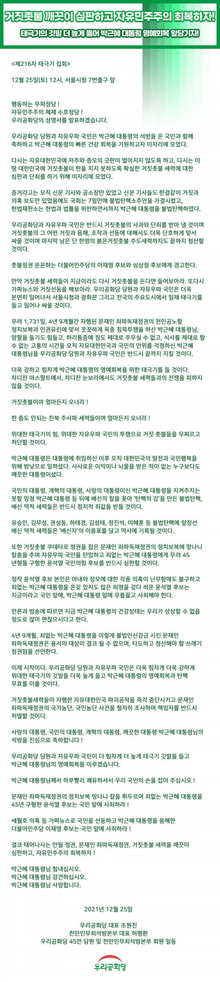 ¿ì¸®°øÈ´ç ´ç¿ø°ú ÀÚÀ¯¿ìÆÄ ±¹¹ÎÀÌ ´õ ÈûÂ÷°Ô ´õ ³ô°Ô űر⠱ê¹ßÀ» µé°í ¹Ú±ÙÇý ´ëÅë·É´ÔÀÇ ¸í¿¹È¸º¹À» ÀÌ·ç°Ú½À´Ï´Ù.