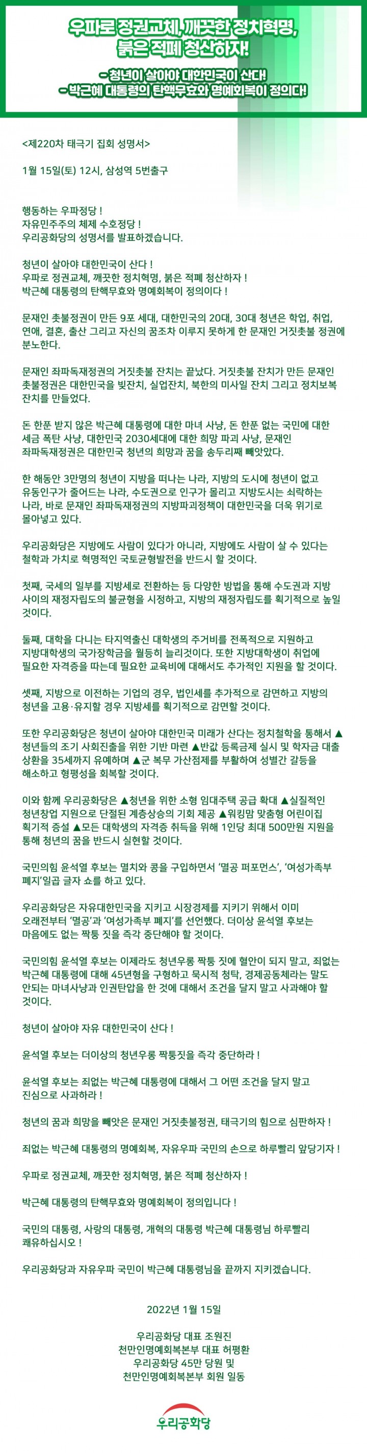 ¿ì¸®°øÈ´ç°ú ÀÚÀ¯¿ìÆÄ ±¹¹ÎÀÌ ¹Ú±ÙÇý ´ëÅë·É´ÔÀ» ³¡±îÁö ÁöŰ°Ú½À´Ï´Ù.