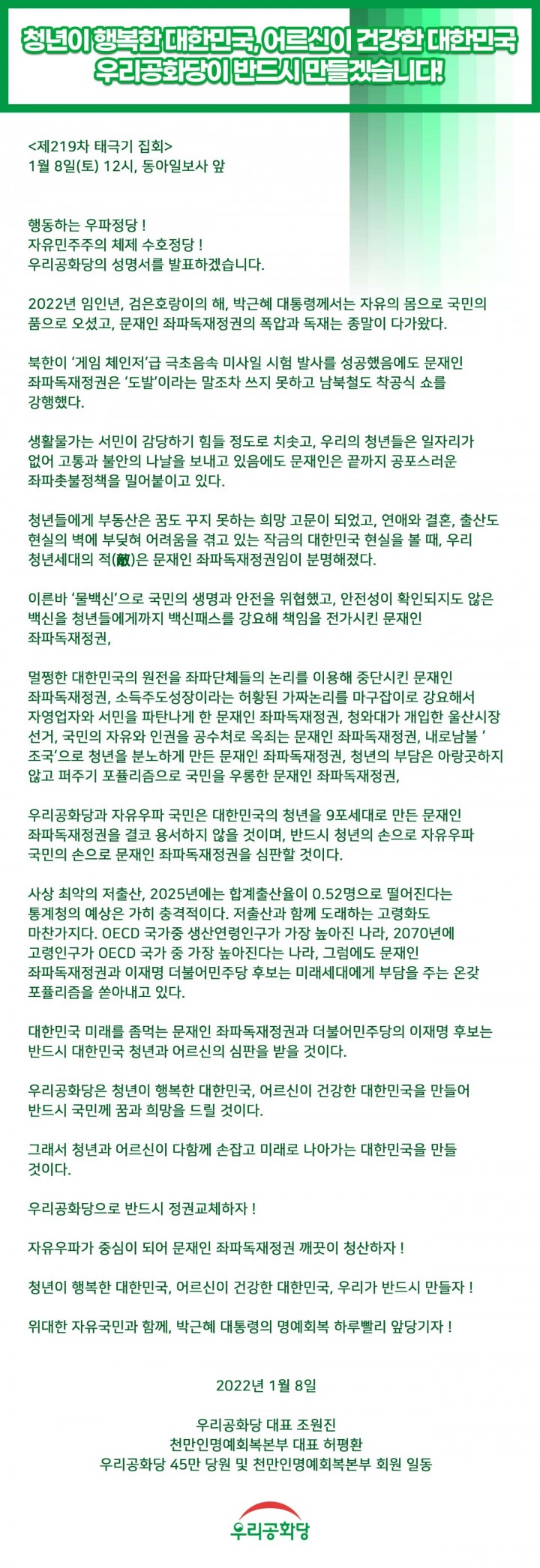 ¸ÖÂÄÇÑ ´ëÇѹα¹ÀÇ ¿øÀüÀ» ÁÂÆÄ´ÜüµéÀÇ ³í¸®¸¦ ÀÌ¿ëÇØ ÁߴܽÃŲ ¹®ÀçÀÎ ÁÂÆÄµ¶ÀçÁ¤±Ç, ¼ÒµæÁÖµµ¼ºÀåÀ̶ó´Â ÇãȲµÈ °¡Â¥³í¸®¸¦ ¸¶±¸ÀâÀÌ·Î °¿äÇØ¼ ÀÚ¿µ¾÷ÀÚ¿Í ¼¹ÎÀ» ÆÄź³ª°Ô ÇÑ ¹®ÀçÀÎ ÁÂÆÄµ¶ÀçÁ¤±Ç, û¿Í´ë°¡ °³ÀÔÇÑ ¿ï»ê½ÃÀå ¼±°Å, ±¹¹ÎÀÇ ÀÚÀ¯¿Í ÀαÇÀ» °ø¼öó·Î ¿ÁÁË´Â ¹®ÀçÀÎ ÁÂÆÄµ¶ÀçÁ¤±Ç, ³»·Î³²ºÒ ¡®Á¶±¹¡¯À¸·Î û³âÀ» ºÐ³ëÇÏ°Ô ¸¸µç ¹®ÀçÀÎ ÁÂÆÄµ¶ÀçÁ¤±Ç, û³âÀÇ ºÎ´ãÀº ¾Æ¶û°÷ÇÏÁö ¾Ê°í ÆÛÁÖ±â Æ÷ǽ¸®ÁòÀ¸·Î ±¹¹ÎÀ» ¿ì·ÕÇÑ ¹®ÀçÀÎ ÁÂÆÄµ¶ÀçÁ¤±Ç,