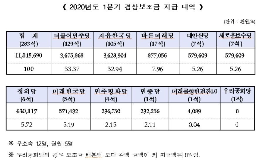 "¶È°°ÀÌ ÀǼ®ÀÌ 1¼®Â¥¸® Á¤´çÀε¥ º¸Á¶±ÝÀº ¼ö¾ï¿ø¾¿ Â÷À̰¡ ³ª´Â °æ¿ìµµ ÀÖ¾ú´Ù. ¹ÎÁß´çÀº 2¾ï3225¸¸¿ø(2.11%), ¹Ì·¡¸¦ÇâÇÑÀüÁø4.0Àº 408¸¸¿ø(0.04%), ¿ì¸®°øÈ´çÀº ÇÑ Ç¬µµ ¹ÞÁö ¸øÇß´Ù. "±âº»ÀûÀ¸·Î ÀüÁø´çó·³ ¡®ÀǼ® 1¼® ¸ò¡¯À¸·Î °è»êÇϸé 408¸¸¿øÀ» ¹Þ´Â °Ô ¸Â´Ù"°í ¼±°üÀ§´Â ¼³¸íÇÑ´Ù. ´Ù¸¸ ¹ÎÁß´çÀº "ÃÖ±Ù Áö¹æ¼±°Å¿¡¼ µæÇ¥ ºñÀ²ÀÌ 0.5% ÀÌ»óÀÎ Á¤´çÀº 2%¸¦ ¹èºÐÇÑ´Ù"´Â ¹ý(Á¤Ä¡Àڱݹý 27Á¶)¿¡ µû¶ó º¸Á¶±Ý ÃѾ×ÀÇ 2% °¡·®(¾à 2¾ï¿ø)À» ¹èºÐ¹ÞÀ¸¸ç ¼ö·É¾×ÀÌ Å©°Ô ´Ã¾ú´Ù.