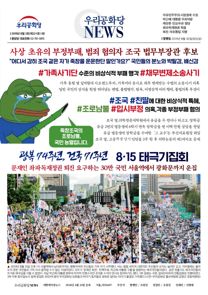 2019³â 8¿ù 15ÀÏ ¿ÀÈÄ 1½Ã ¼¿ï¿ª¿¡¼ ³²´ë¹®±îÁö´Â ÇüÇü»ö»öÀÇ ¿ì»êµé·Î °¡µæ Â÷±â ½ÃÀÛÇß´Ù. ºñ´Â Á¡Á¡ ¼¼Â÷°Ô ³»·ÈÁö¸¸ ¿ì»êµéÀÇ ¼ýÀÚ´Â ´Ã¾î¸¸ °¬°í, ÁöÇÏö¿¡´Â ¿Ã¶ó ¿ÀÁö ¸øÇÑ ±¹¹Îµé·Î °¡µæ Â÷¼ ¿òÁ÷ÀÏ ¼ö°¡ ¾ø´Â Áö°æÀ̾ú´Ù. ¸ðµÎ°¡ ¡®¹®ÀçÀÎ ÅðÁø¡¯, ¡®ÅºÇÙ¹«È¿, ¹Ú±ÙÇý ´ëÅë·É ±¸Ã⡯À» ¿°¿øÇÏ´Â ¾Ö±¹±¹¹ÎµéÀ̾ú´Ù. ±½Àº ºøÁٱ⵵ ¾Ö±¹±¹¹ÎµéÀÇ ¶ß°Å¿î ¾Ö±¹½ÉÀ» ½ÄÈú ¼ö ¾ø¾ú´Ù. À̳¯ ¹Ú±ÙÇý ´ëÅë·É Á¤ºÎÀÇ ¸¶Áö¸· ¹ÎÁ¤¼ö¼®ÀÎ Á¶´ëȯ ¼ö¼®ÀÌ ¿¬»ç·Î Âü¿©Çϱ⵵ Çß´Ù. 2ºÎ Áýȸ´Â ±¹º», ÀÏÆÄ¸¸ÆÄ¿ÍÀÇ ¿¬ÇÕÁýȸ·Î ÁøÇàµÇ¾ú´Ù.