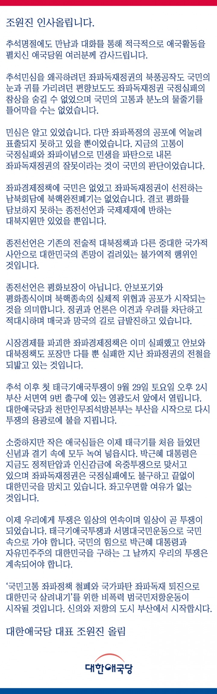 * °¢ÀÚÀÇ ÀÛÀº °³ÀÎÀû ¾Ö±¹½ÉÀ» ¹ö¸®°í, ¹ìº¸´Ù ÁöÇý·Ó°í, ºñµÑ±âó·³ ¿ÂÀ¯Çϸç, »çÀÚó·³ ¿ë°¨Çϰí, ¾çó·³ °â¼ÕÇÏ°Ô ¹Ú±ÙÇý´ëÅë·ÉÀÇ ¿ÁÁßÅõÀï¿¡ µ¿ÂüÇϸç, Á¶¿øÁø´ëÇ¥´ÔÀÇ ¸®´õ½Ê°ú ÅõÀïÇØ¾ß ÇÕ´Ï´Ù.