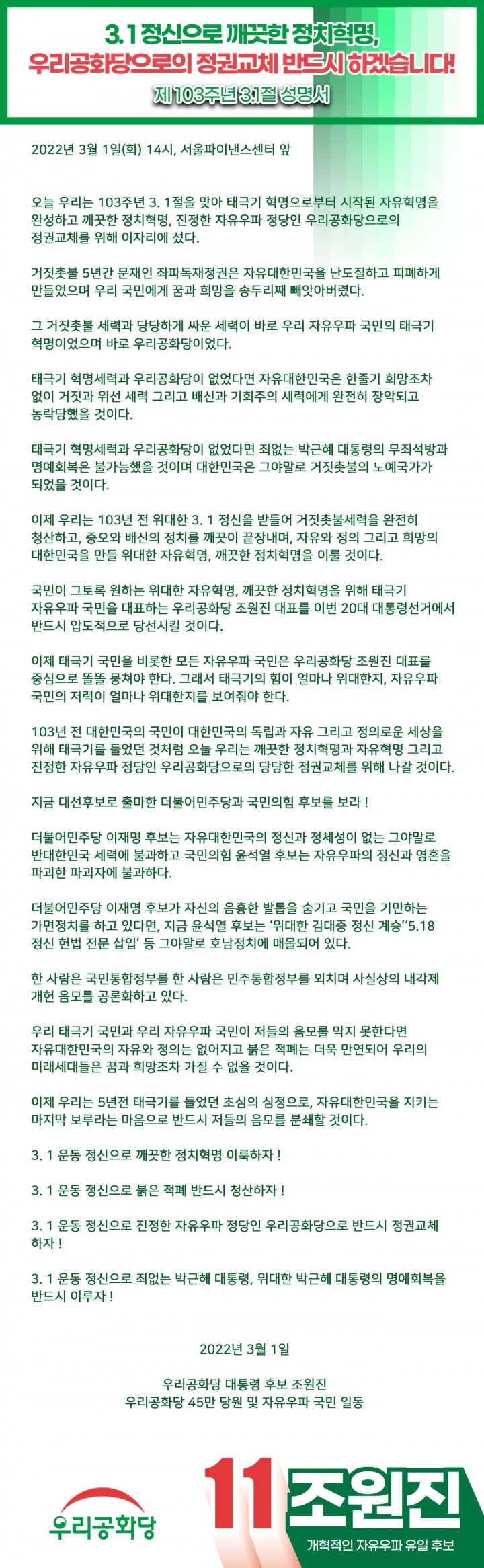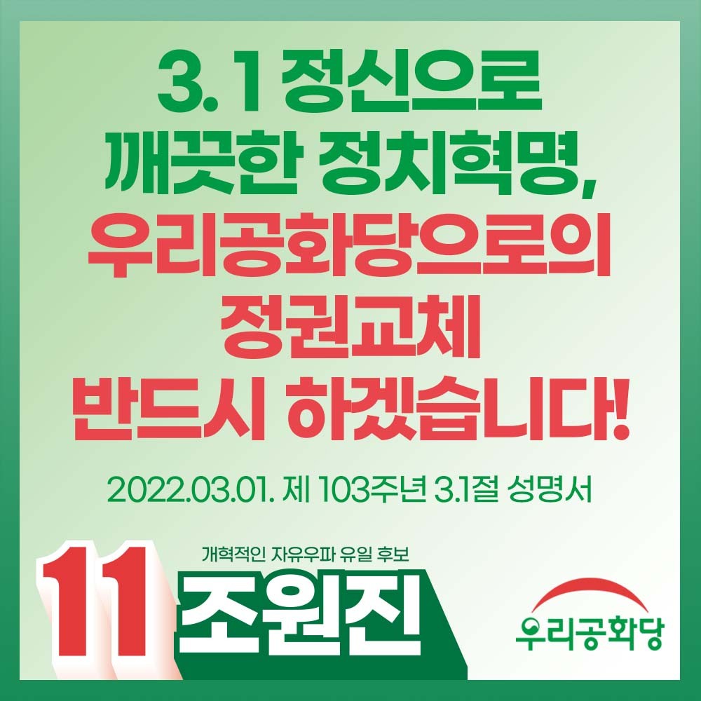3/1(È) [¼¿ï ÃÑÁý°á À¯¼¼] 11¹ø Á¶¿øÁø ¿ì¸®°øÈ´ç ´ëÅë·É Èĺ¸ ÀÏÁ¤