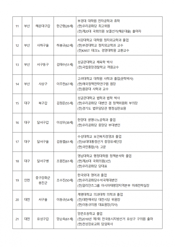 4¿ù 15ÀÏ Á¦21´ë ±¹È¸ÀÇ¿ø¼±°Å Áö¿ª±¸ Èĺ¸ÀÚ ¹× ºñ·Ê´ëÇ¥ Èĺ¸ÀÚ Ãßõ½Åû °ø°í