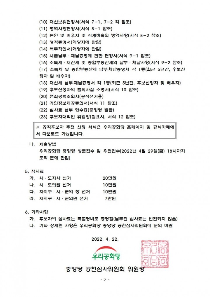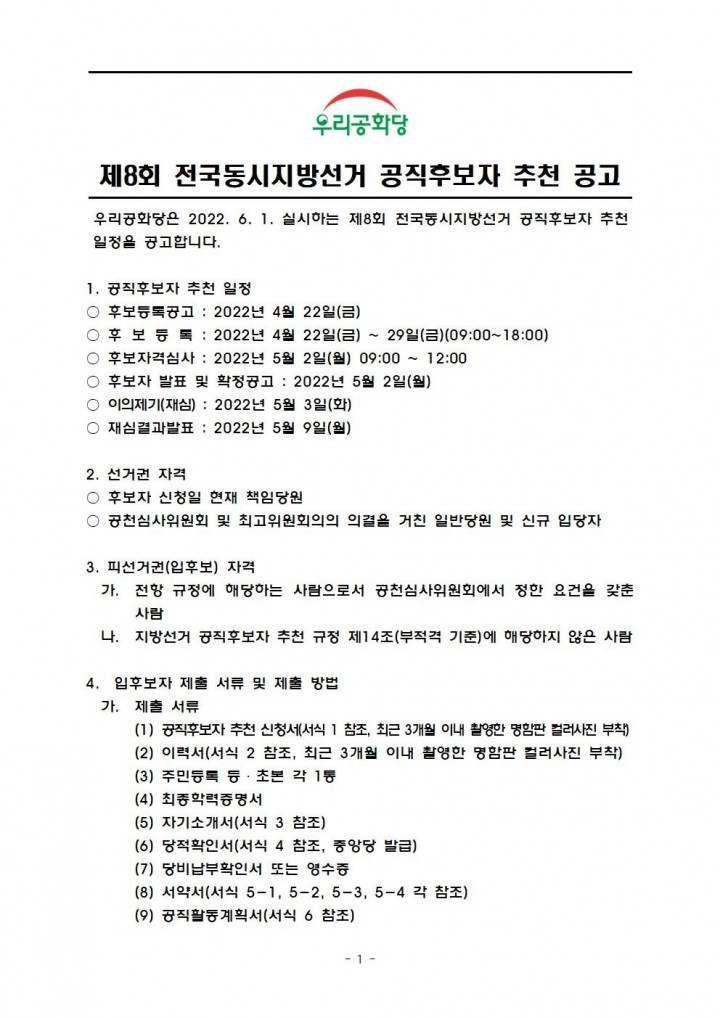 [¿ì¸®°øÈ´ç] Á¦22´ë ±¹È¸ÀÇ¿ø¼±°Å Èĺ¸ÀÚ Ãßõ °ø°í ¾È³»