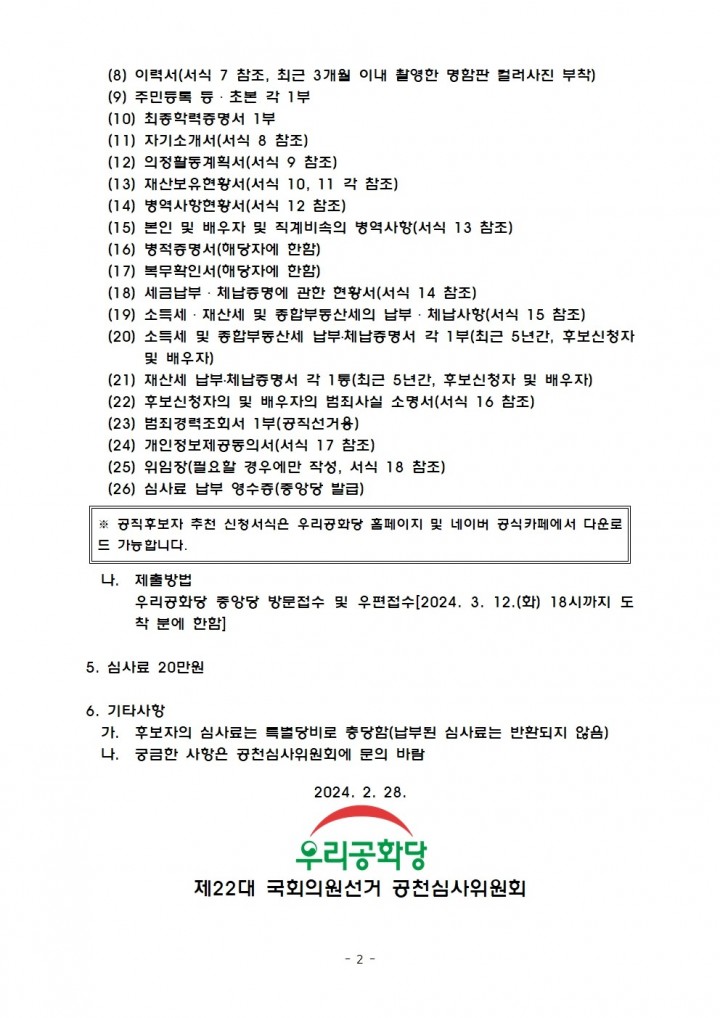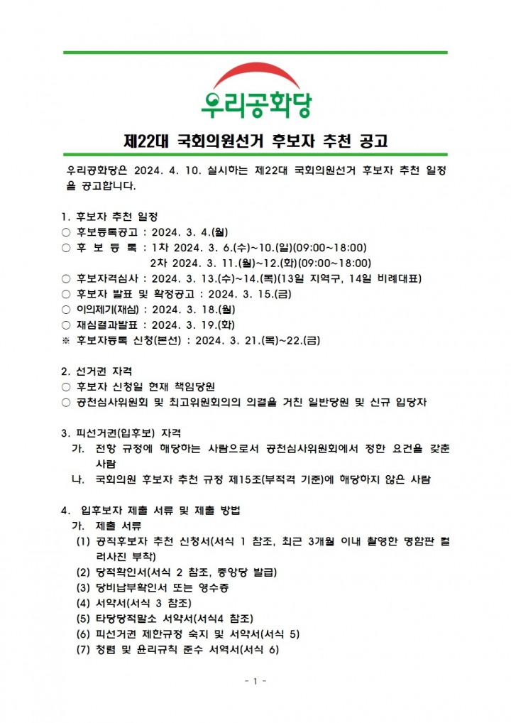 ¿ì¸®°øÈ´çÀº 2024. 4. 10. ½Ç½ÃÇÏ´Â Á¦22´ë ±¹È¸ÀÇ¿ø¼±°Å Èĺ¸ÀÚ Ãßõ ÀÏÁ¤À» °ø°íÇÕ´Ï´Ù.