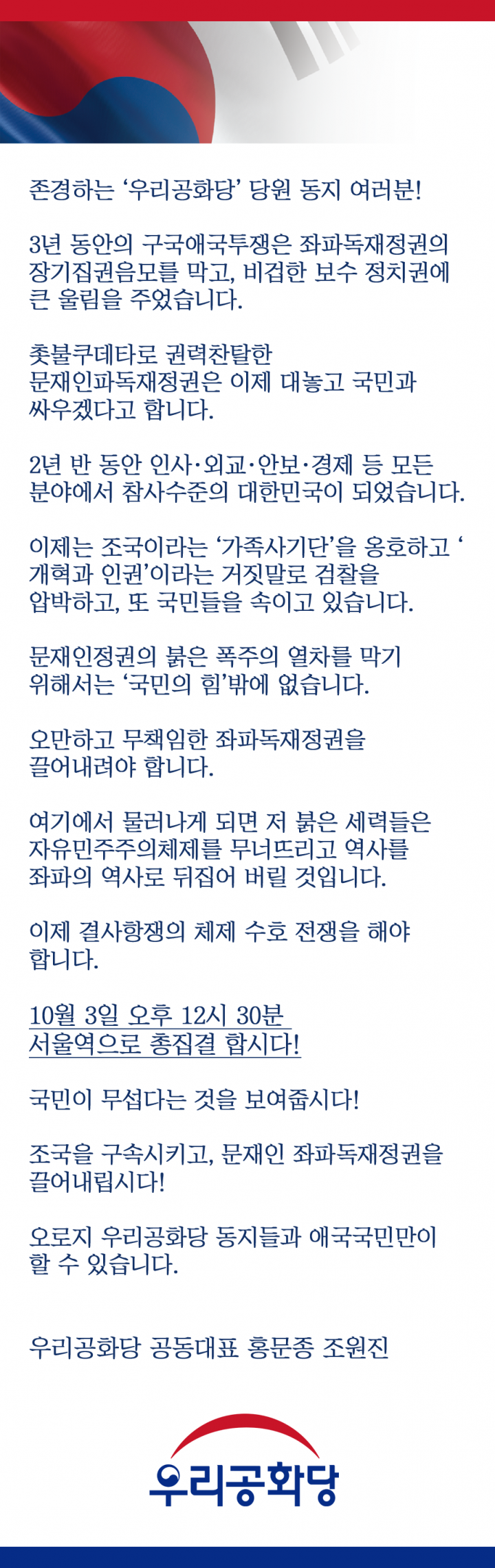 19.10.09(Çѱ۳¯) Ưº°±âÀÚȸ°ß : Á¶±¹ ±¸¼Ó & ¹®ÀçÀÎ ÁÂÆÄµ¶ÀçÁ¤±Ç ÅðÁø! ¿ÀÈÄ 4½Ã, ¼¼Á¾¹®Èȸ°ü ¾Õ