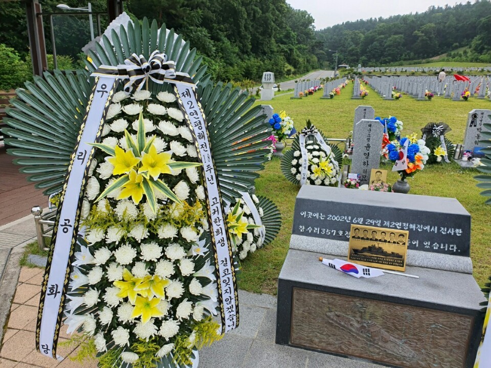 2002³â 6¿ù 29ÀÏ, Á¦2¿¬ÆòÇØÀü¿¡¼ Àü»çÇÑ Âü¼ö¸® 357È£ÀÇ ¿©¼¸ ¿ë»ç¸¦ ¸ð½Å °÷¿¡ ¿ì¸®°øÈ´çÀº Çåȸ¦ ÇÏ¿´½À´Ï´Ù.