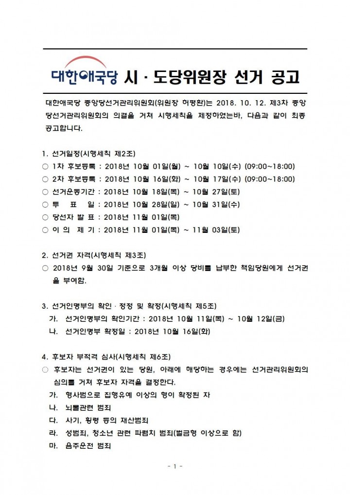 ´ëÇѾֱ¹´ç ½Ãµµ´çÀ§¿øÀå¼±°Å °ø°í(°æºÏµµ´çÀ§¿øÀå ¼±°Å ÅõÇ¥ ÀÏÁ¤ º¯°æ)