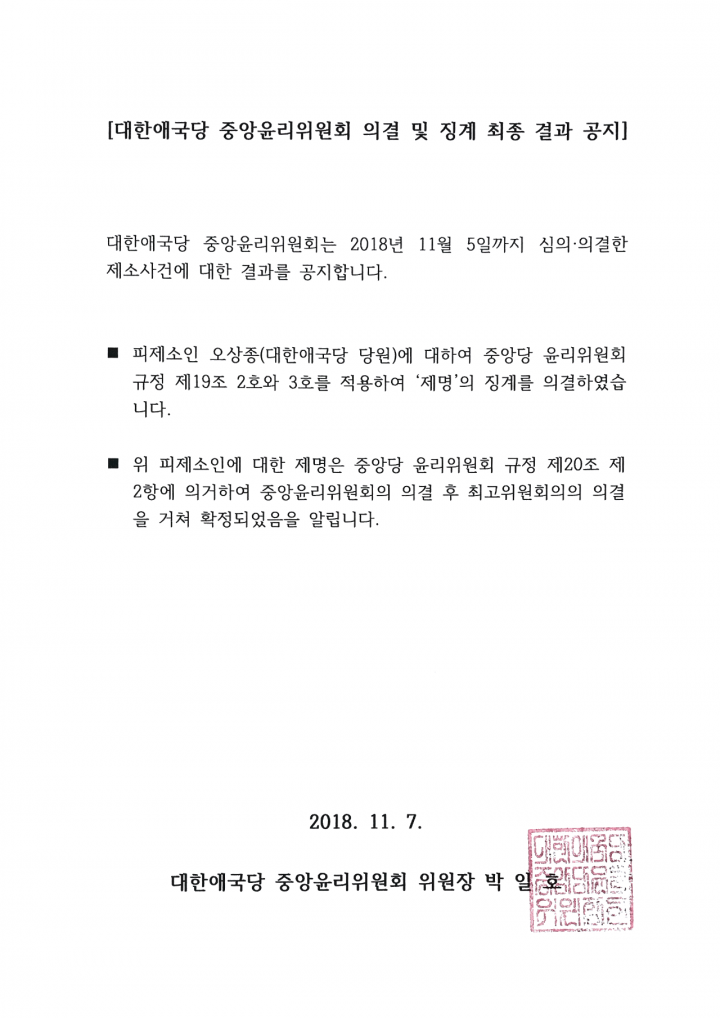 ´ëÇѾֱ¹´ç Áß¾ÓÀ±¸®À§¿øÈ¸ ÀÇ°á °á°ú °øÁö