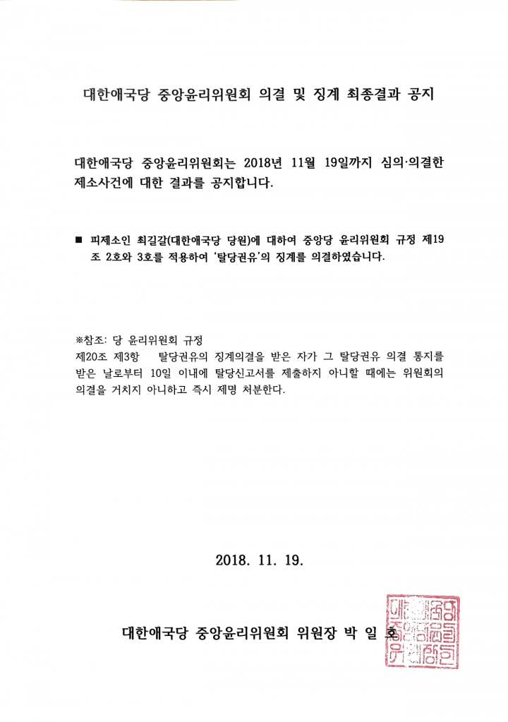 ´ëÇѾֱ¹´ç Áß¾ÓÀ±¸®À§¿øÈ¸ ÀÇ°á °á°ú °øÁö