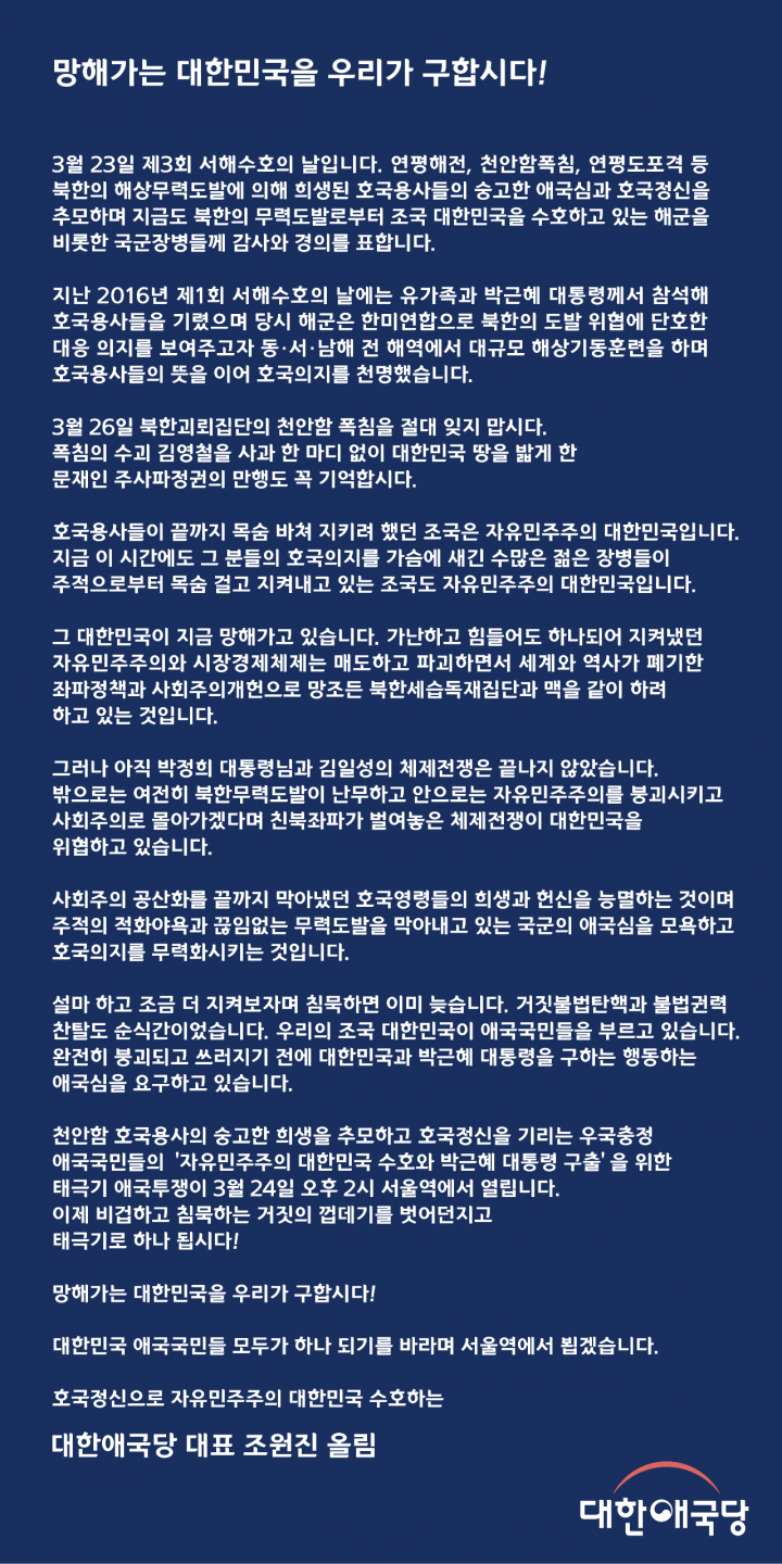 ¹Ú±ÙÇý ´ëÅë·ÉÀÇ ¶æ! ´ëÇѾֱ¹´ç Áß½ÉÀ¸·Î ¹¶ÃÄ ´ëÇѹα¹À» ÁöÄÑ´Þ¶ó