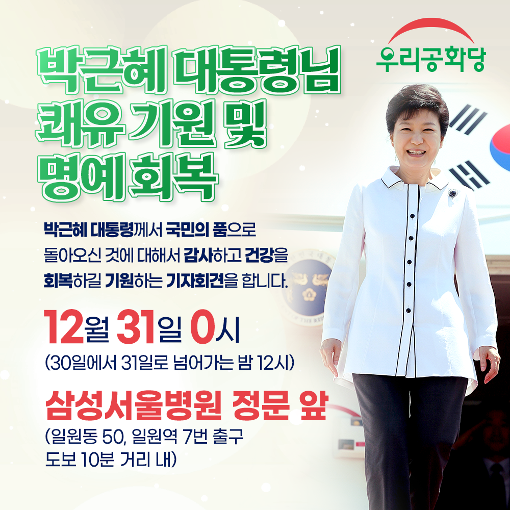 12/27(¿ù) ¹Ú±ÙÇý ´ëÅë·É´Ô ÄèÀ¯±â¿ø ¹× ¸í¿¹È¸º¹ ±âÀÚȸ°ß ¾È³»(1½Ã, û¿Í´ë ºÐ¼ö´ë¾Õ)