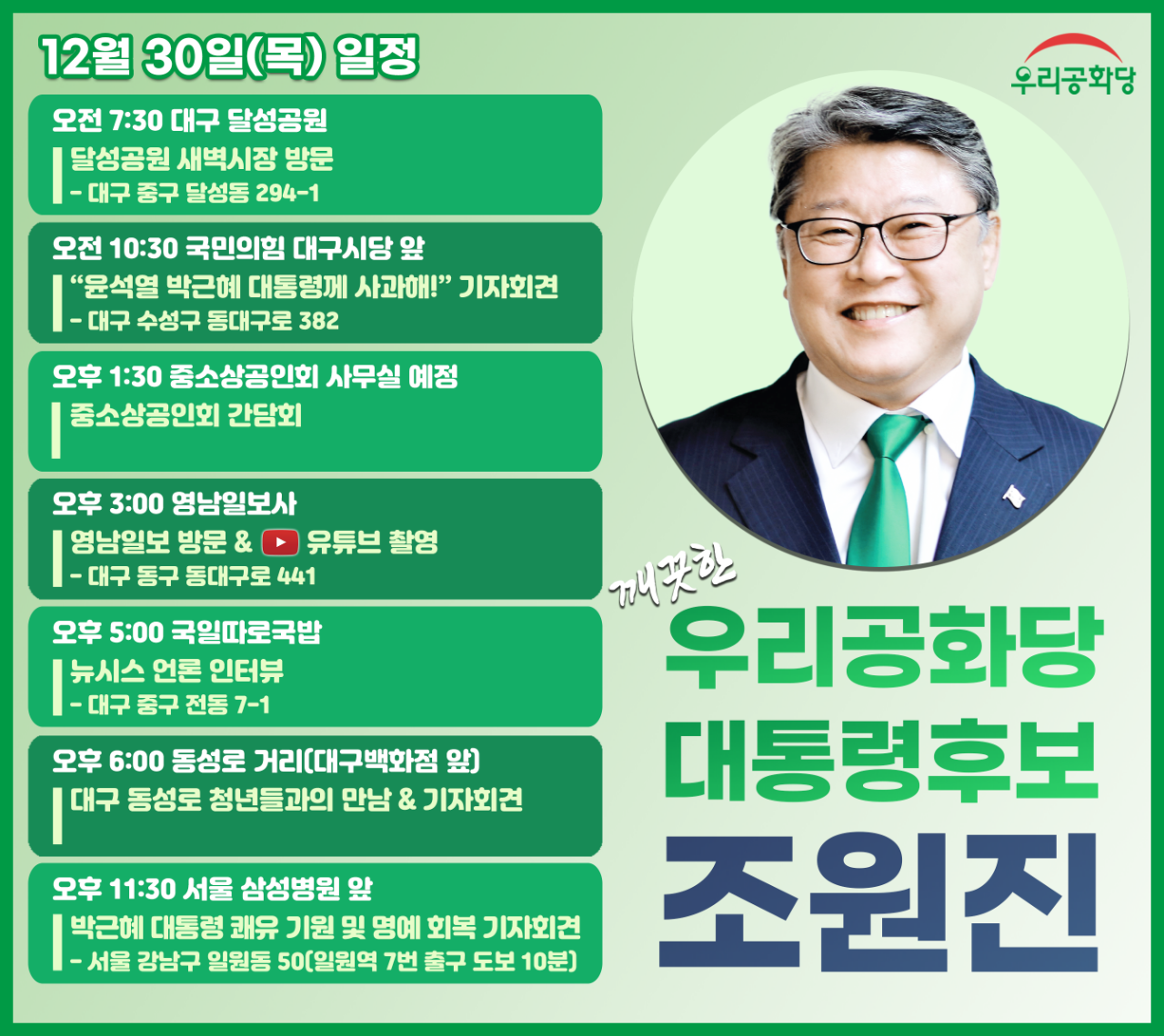 12/29(¼ö) Á¶¿øÁø ¿ì¸®°øÈ´ç ´ëÅë·É Èĺ¸ ÀÏÁ¤