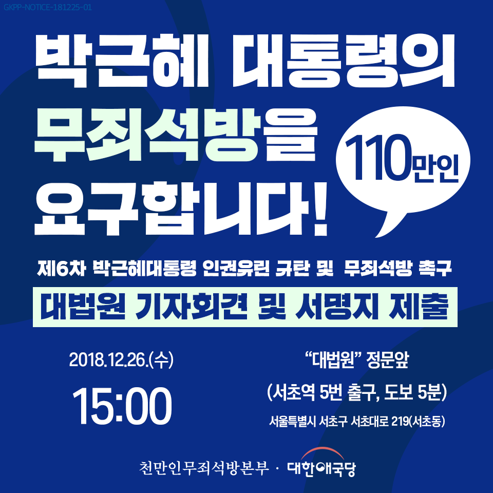 18.12.28.(±Ý) 15:00, ¹Ú±ÙÇý ´ëÅë·ÉÀÇ ¹«Á˼®¹æÀ» ¿ä±¸ÇÏ´Â 110¸¸ ¸í ´ëÇѹα¹ ±¹¹Î ¼¸íºÎ¸¦ ±¹Á¦»çȸ¿Í À¯¿£(UN), ¹Ì±¹ Á¤ºÎ ¹× ÀÇȸ¿¡ Àü´ÞÇÏ´Â ±âÀÚȸ°ß