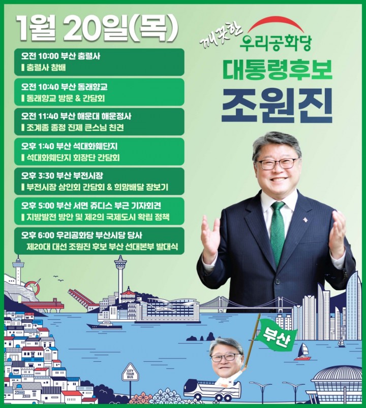 1/19(¼ö) Á¶¿øÁø ¿ì¸®°øÈ´ç ´ëÅë·É Èĺ¸ ÀÏÁ¤(¿ï»ê)