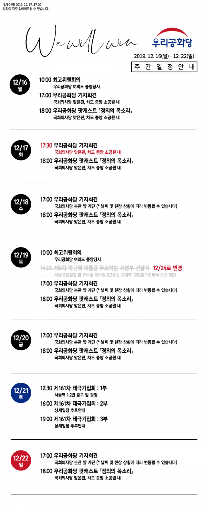 <2019³â 12¿ù 19ÀÏ(¸ñ) ¿ì¸®°øÈ´ç ÁÖ¿äÀÏÁ¤ ¾È³»>