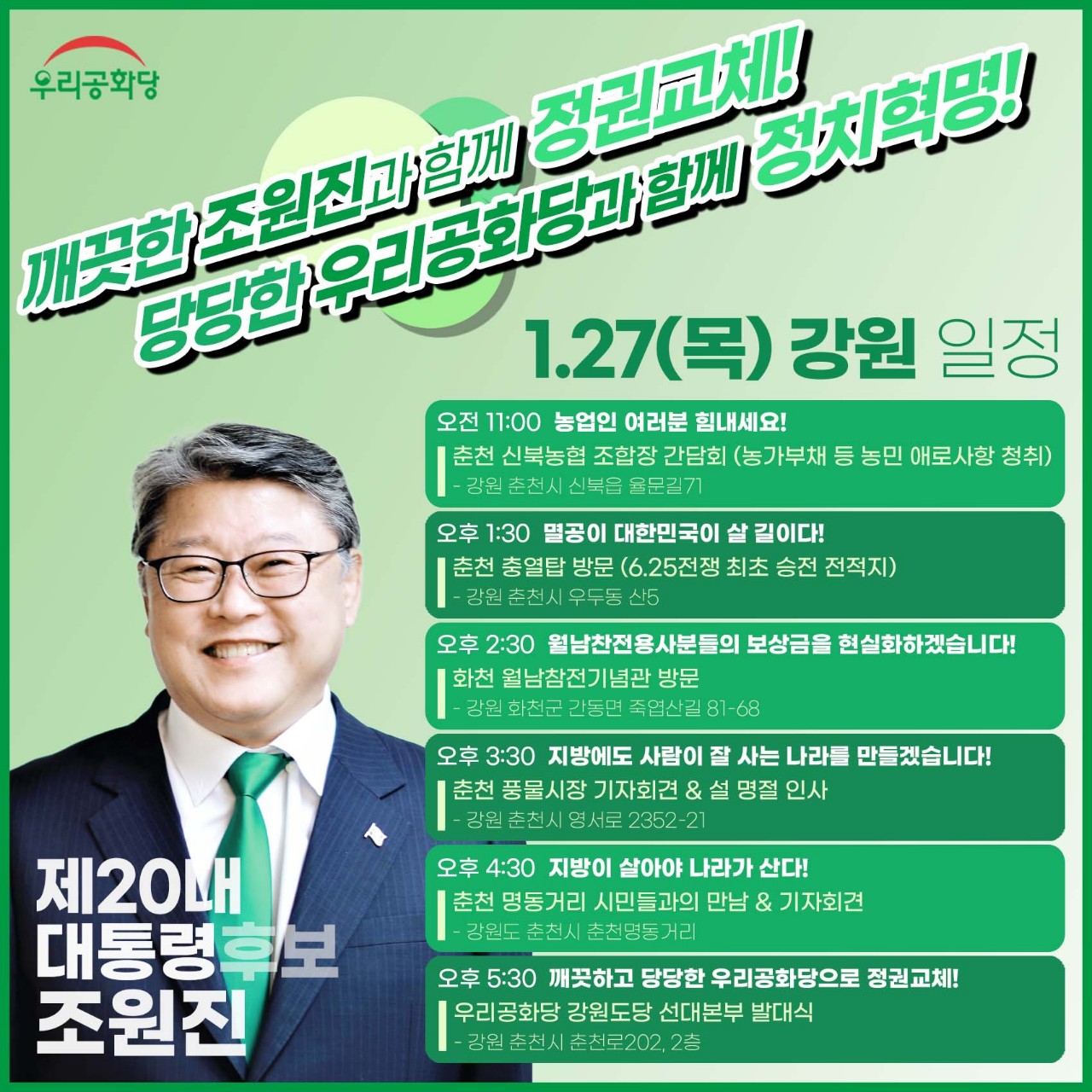 1/25(È) Á¶¿øÁø ¿ì¸®°øÈ´ç ´ëÅë·É Èĺ¸ ÀÏÁ¤(ºÎõ, ±¤¸í, ¼º³², ¼ö¿ø)