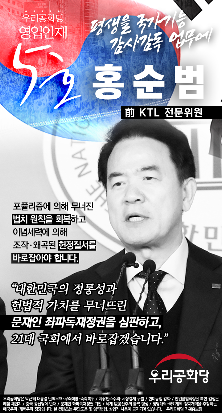 ¿ì¸®°øÈ´ç ¿µÀÔ ÀÎÀç 5È£ È«¼ø¹ü Àü KTL Àü¹®À§¿øÀÌ 28ÀÏ(È) ¿À´Ã ¿ÀÈÄ 2½Ã 30ºÐ ±¹È¸ Á¤·Ð°ü¿¡¼ Á¤Ä¡ Ãâ»çÇ¥¸¦ ´øÁø´Ù. 28ÀÏ ¿ì¸®°øÈ´ç¿¡ ¿µÀÔµÈ È«¼ø¹ü Àü¹®À§¿øÀº Æò»ýÀ» ±¹°¡ ±â´É Àü¹Ý¿¡ ´ëÇÑ °¨½Ã¡¤°¨µ¶ ¾÷¹«¿¡ Çå½ÅÇØ¿Â °¨»çÁ÷ °ø¹«¿øÀ¸·Î¼ ¹«³ÊÁ®°¡´Â ´ëÇѹα¹À» Àç°ÇÇϱâ À§ÇØ Áö±Ý±îÁö ½×¾Æ¿Â Àü¹® ¿ª·®À» ¹ßÈÖÇÒ °èȹÀÌ´Ù.