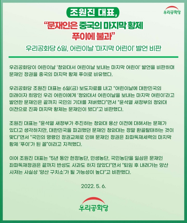 ¿ì¸®°øÈ´ç Á¶¿øÁø ´ëÇ¥´Â 6ÀÏ(±Ý) º¸µµÀڷḦ ³»°í "¾î¸°À̳¯¿¡ ´ëÇѹα¹ÀÇ ¹Ì·¡ÀÌÀÚ Èñ¸ÁÀÎ ¿ì¸® ¾î¸°ÀÌ¿¡°Ô ¡®Ã»¿Í´ë¼ ¾î¸°À̳¯À» º¸³»´Â ¸¶Áö¸· ¾î¸°ÀÌ¡¯¶ó°í ¹ß¾ðÇÑ ¹®ÀçÀÎÀº ³¡±îÁö ±¹¹ÎÀÇ ±â´ë¸¦ Àú¹ö·È´Ù"¸é¼ "À±¼®¿ »õÁ¤ºÎÀÇ Ã»¿Í´ë ÀÌÀüÀ¸·Î ÁøÂ¥ ¸¶Áö¸· ȲÁ¦´Â ¹®ÀçÀÎÀÌ µÆ´Ù"°í ºñÆÇÇß´Ù.