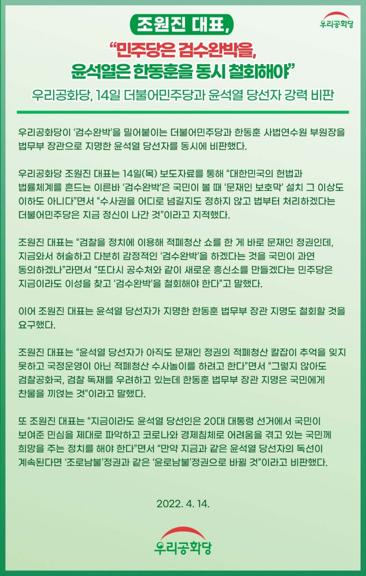 ¿ì¸®°øÈ­´ç Á¶¿øÁø ´ëÇ¥´Â 14ÀÏ(¸ñ) º¸µµÀڷḦ ÅëÇØ "´ëÇѹα¹ÀÇ Çå¹ý°ú ¹ý·üü°è¸¦ Èçµå´Â À̸¥¹Ù ¡®°Ë¼ö¿Ï¹Ú¡¯Àº ±¹¹ÎÀÌ º¼ ¶§ ¡®¹®ÀçÀÎ º¸È£¸·¡¯ ¼³Ä¡ ±× ÀÌ»óµµ ÀÌÇϵµ ¾Æ´Ï´Ù"¸é¼­ "¼ö»ç±ÇÀ» ¾îµð·Î ³Ñ±æÁöµµ Á¤ÇÏÁö ¾Ê°í ¹ýºÎÅÍ Ã³¸®Çϰڴٴ ´õºÒ¾î¹ÎÁÖ´çÀº Áö±Ý Á¤½ÅÀÌ ³ª°£ °Í"À̶ó°í ÁöÀûÇß´Ù.