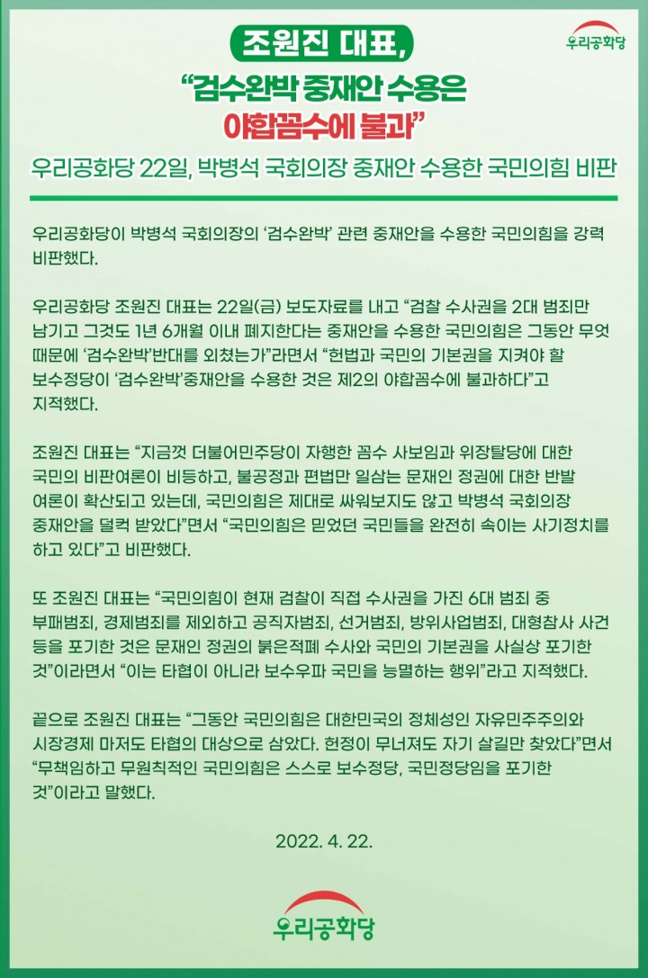 ¿ì¸®°øÈ­´ç Á¶¿øÁø ´ëÇ¥´Â 22ÀÏ(±Ý) º¸µµÀڷḦ ³»°í "°ËÂû ¼ö»ç±ÇÀ» 2´ë ¹üÁ˸¸ ³²±â°í ±×°Íµµ 1³â 6°³¿ù À̳» ÆóÁöÇÑ´Ù´Â ÁßÀç¾ÈÀ» ¼ö¿ëÇÑ ±¹¹ÎÀÇÈûÀº ±×µ¿¾È ¹«¾ù ¶§¹®¿¡ ¡®°Ë¼ö¿Ï¹Ú¡¯¹Ý´ë¸¦ ¿ÜÃÆ´Â°¡"¶ó¸é¼­ "Çå¹ý°ú ±¹¹ÎÀÇ ±âº»±ÇÀ» ÁöÄÑ¾ß ÇÒ º¸¼öÁ¤´çÀÌ ¡®°Ë¼ö¿Ï¹Ú¡¯ÁßÀç¾ÈÀ» ¼ö¿ëÇÑ °ÍÀº Á¦2ÀÇ ¾ßÇղļö¿¡ ºÒ°úÇÏ´Ù"°í ÁöÀûÇß´Ù.