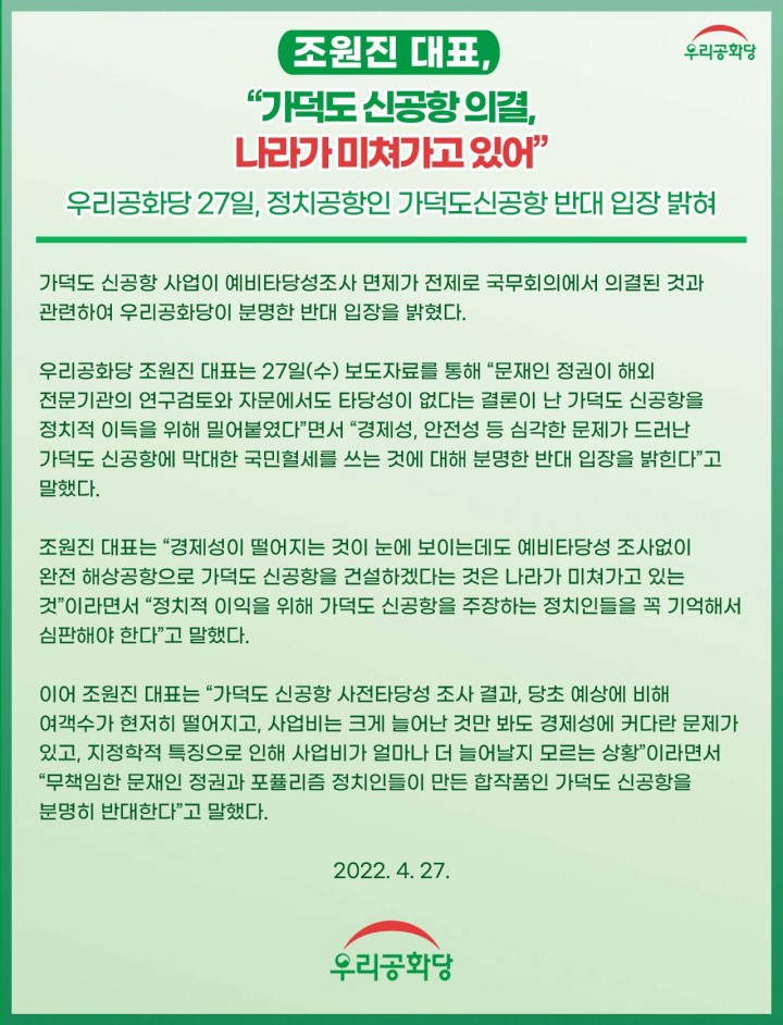 ¿ì¸®°øÈ­´ç Á¶¿øÁø ´ëÇ¥´Â 27ÀÏ(¼ö) º¸µµÀڷḦ ÅëÇØ "¹®ÀçÀÎ Á¤±ÇÀÌ ÇØ¿Ü Àü¹®±â°üÀÇ ¿¬±¸°ËÅä¿Í ÀÚ¹®¿¡¼­µµ Ÿ´ç¼ºÀÌ ¾ø´Ù´Â °á·ÐÀÌ ³­ °¡´öµµ ½Å°øÇ×À» Á¤Ä¡Àû À̵æÀ» À§ÇØ ¹Ð¾îºÙ¿´´Ù"¸é¼­ "°æÁ¦¼º, ¾ÈÀü¼º µî ½É°¢ÇÑ ¹®Á¦°¡ µå·¯³­ °¡´öµµ ½Å°øÇ׿¡ ¸·´ëÇÑ ±¹¹ÎÇ÷¼¼¸¦ ¾²´Â °Í¿¡ ´ëÇØ ºÐ¸íÇÑ ¹Ý´ë ÀÔÀåÀ» ¹àÈù´Ù"°í ¸»Çß´Ù.