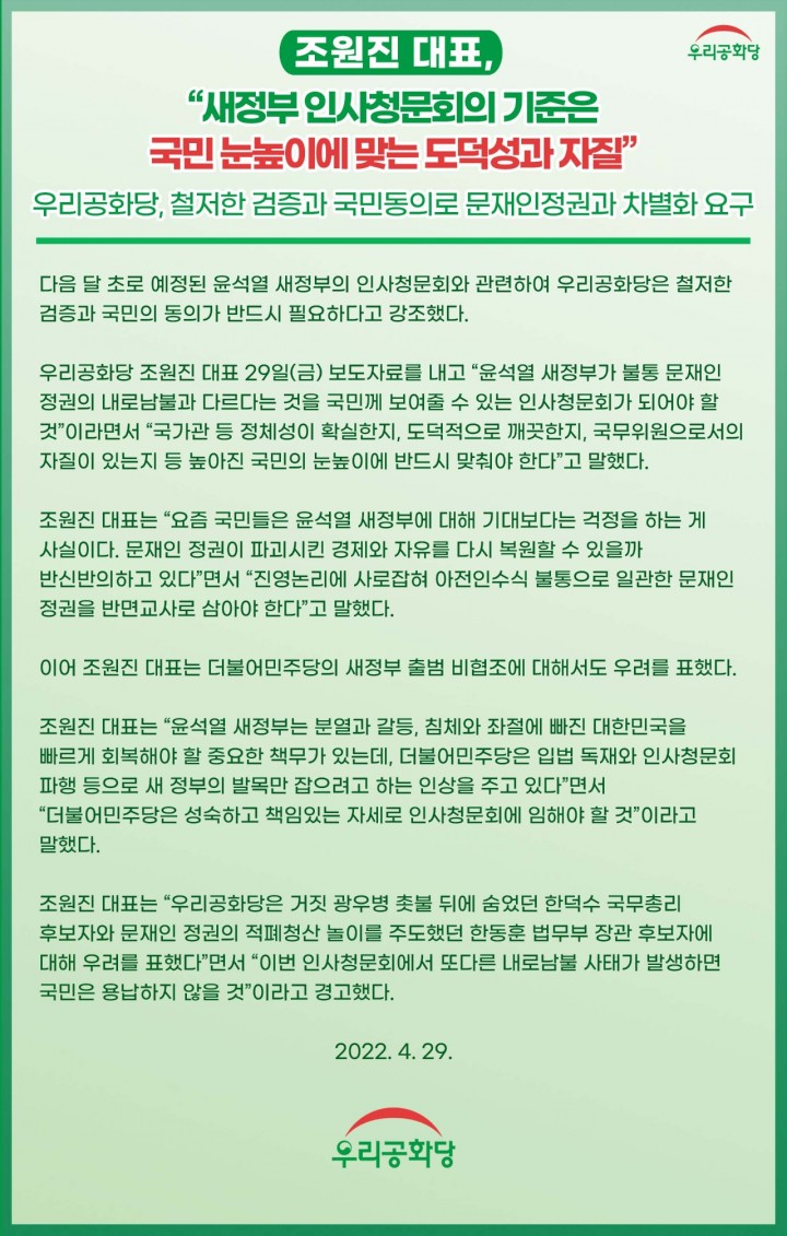 ¿ì¸®°øÈ­´ç Á¶¿øÁø ´ëÇ¥ 29ÀÏ(±Ý) º¸µµÀڷḦ ³»°í "À±¼®¿­ »õÁ¤ºÎ°¡ ºÒÅë ¹®ÀçÀÎ Á¤±ÇÀÇ ³»·Î³²ºÒ°ú ´Ù¸£´Ù´Â °ÍÀ» ±¹¹Î²² º¸¿©ÁÙ ¼ö ÀÖ´Â Àλçû¹®È¸°¡ µÇ¾î¾ß ÇÒ °Í"À̶ó¸é¼­ "±¹°¡°ü µî Á¤Ã¼¼ºÀÌ È®½ÇÇÑÁö, µµ´öÀûÀ¸·Î ±ú²ýÇÑÁö, ±¹¹«À§¿øÀ¸·Î¼­ÀÇ ÀÚÁúÀÌ ÀÖ´ÂÁö µî ³ô¾ÆÁø ±¹¹ÎÀÇ ´«³ôÀÌ¿¡ ¹Ýµå½Ã ¸ÂÃç¾ß ÇÑ´Ù"°í ¸»Çß´Ù.