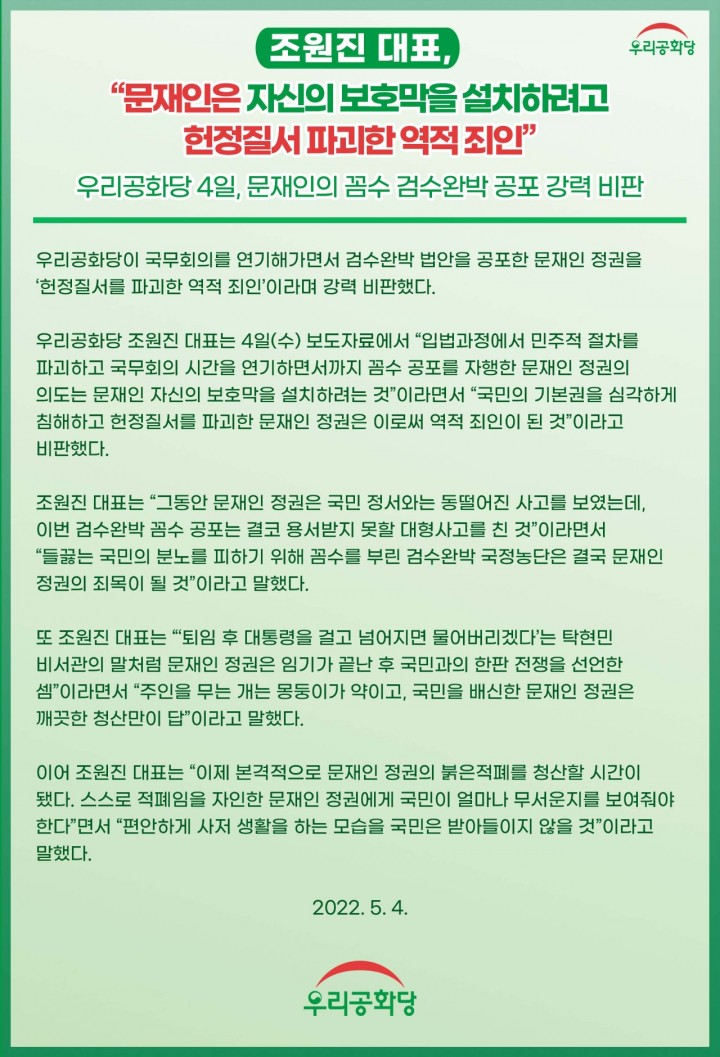 ¿ì¸®°øÈ­´ç Á¶¿øÁø ´ëÇ¥´Â 4ÀÏ(¼ö) º¸µµÀÚ·á¿¡¼­ "ÀÔ¹ý°úÁ¤¿¡¼­ ¹ÎÁÖÀû ÀýÂ÷¸¦ ÆÄ±«ÇÏ°í ±¹¹«È¸ÀÇ ½Ã°£À» ¿¬±âÇϸ鼭±îÁö ²Ä¼ö °øÆ÷¸¦ ÀÚÇàÇÑ ¹®ÀçÀÎ Á¤±ÇÀÇ Àǵµ´Â ¹®ÀçÀÎ ÀÚ½ÅÀÇ º¸È£¸·À» ¼³Ä¡ÇÏ·Á´Â °Í"À̶ó¸é¼­ "±¹¹ÎÀÇ ±âº»±ÇÀ» ½É°¢ÇÏ°Ô Ä§ÇØÇϰí ÇåÁ¤Áú¼­¸¦ ÆÄ±«ÇÑ ¹®ÀçÀÎ Á¤±ÇÀº ÀÌ·Î½á ¿ªÀû ÁËÀÎÀÌ µÈ °Í"À̶ó°í ºñÆÇÇß´Ù.