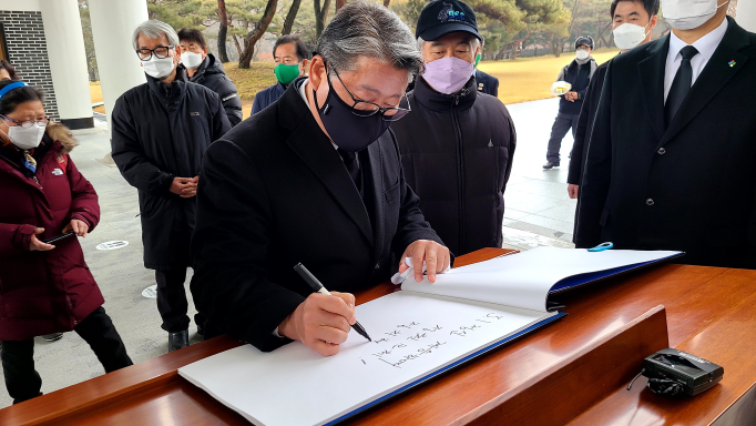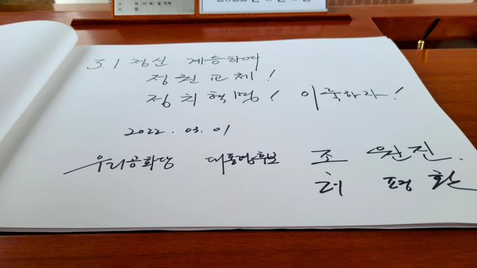 ¿ì¸®°øÈ­´ç Á¶¿øÁø ´ëÅë·É È帰¡ 103ÁÖ³â 3.1ÀýÀ» ¸Â¾Æ ±¹¸³¼­¿ïÇöÃæ¿øÀ» Âü¹èÇϰí 3.1Á¤½ÅÀ¸·Î ºÎÁ¤ºÎÆÐ¼¼·ÂÀ» û»êÇϰí ÀÚÀ¯¿ìÆÄ°¡ ½Â¸®ÇÏ´Â Á¤±Ç±³Ã¼¸¦ ¹Ýµå½Ã ÇÏ°Ú´Ù°í ¹àÇû´Ù.