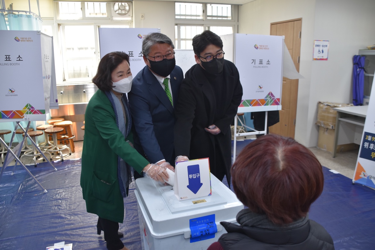 ¿ì¸®°øÈ´ç Á¶¿øÁø ´ëÅë·É È帰¡ ÅõÇ¥ÀÏÀÎ 9ÀÏ ´ë±¸ ¼º´çÁßÇб³ ÅõÇ¥¼Ò¿¡¼ ¾Æ³» ¼ºÈñ¼÷¾¾¿Í ¾Æµé°ú ÇÔ²² ÅõÇ¥¸¦ Çß´Ù.