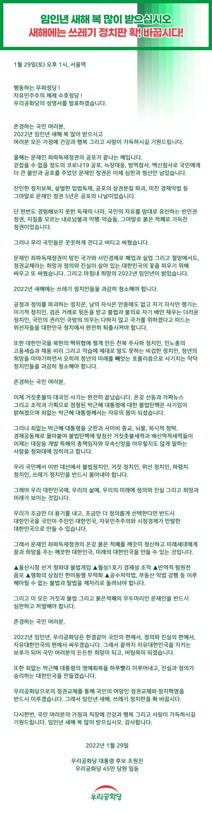 2022³â ÀÓÀγâ, ¿ì¸®°øÈ­´çÀº ÇѰᰰÀÌ ±¹¹ÎÀÇ Æí¿¡¼­, Á¤ÀÇ¿Í Áø½ÇÀÇ Æí¿¡¼­, ÀÚÀ¯´ëÇѹα¹ÀÇ Æí¿¡¼­ ½Î¿ì°Ú½À´Ï´Ù. ±×·¡¼­ ³¡±îÁö ÀÚÀ¯´ëÇѹα¹À» ÁöŰ´Â º¸·ç°¡ µÇ¾î ±¹¹Î ¿©·¯ºÐÀÇ µçµçÇÑ Èñ¸ÁÀÌ µÇ°í, ¹öÆÀ¸ñÀÌ µÇ°Ú½À´Ï´Ù.