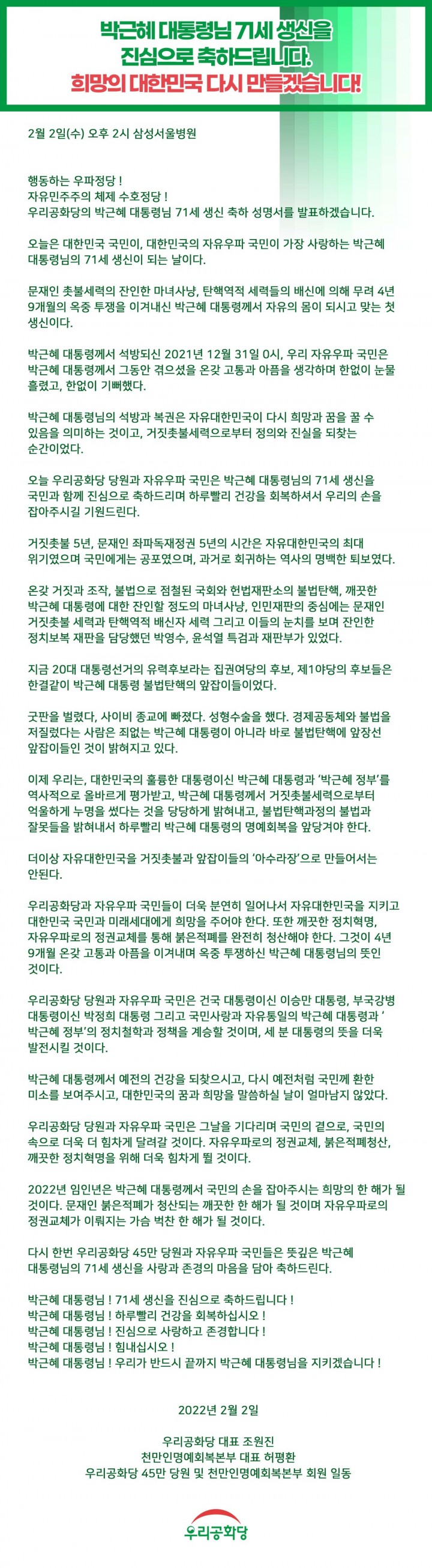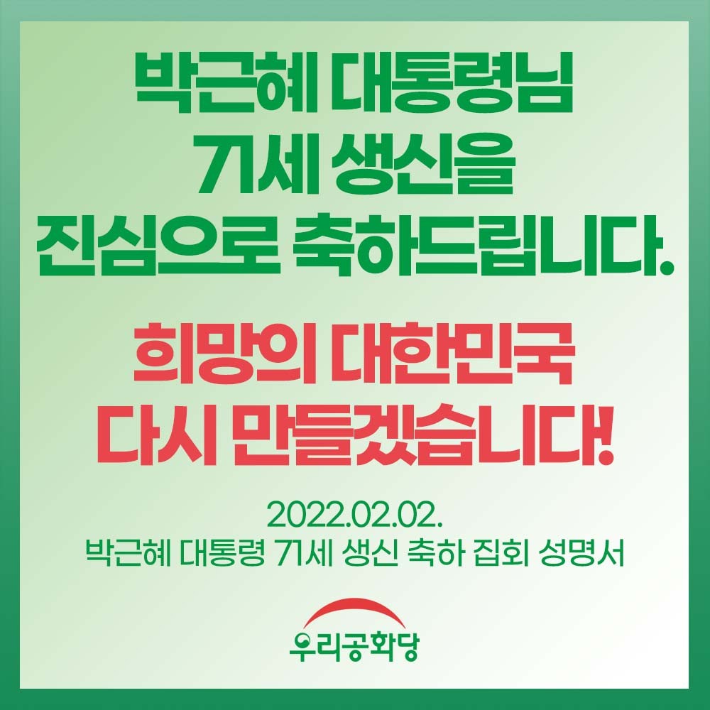 ¿À´Ã ¿ì¸®°øÈ­´ç ´ç¿ø°ú ÀÚÀ¯¿ìÆÄ ±¹¹ÎÀº ¹Ú±ÙÇý ´ëÅë·É´ÔÀÇ 71¼¼ »ý½ÅÀ» ±¹¹Î°ú ÇÔ²² Áø½ÉÀ¸·Î ÃàÇϵ帮¸ç ÇϷ绡¸® °Ç°­À» ȸº¹Çϼż­ ¿ì¸®ÀÇ ¼ÕÀ» Àâ¾ÆÁÖ½Ã±æ ±â¿øµå¸°´Ù.