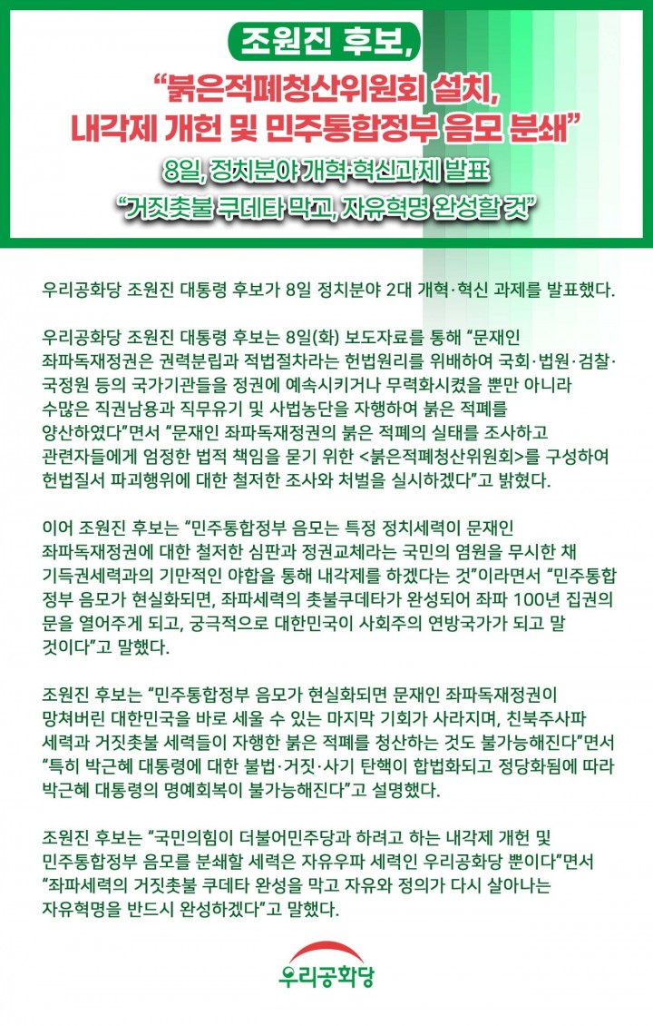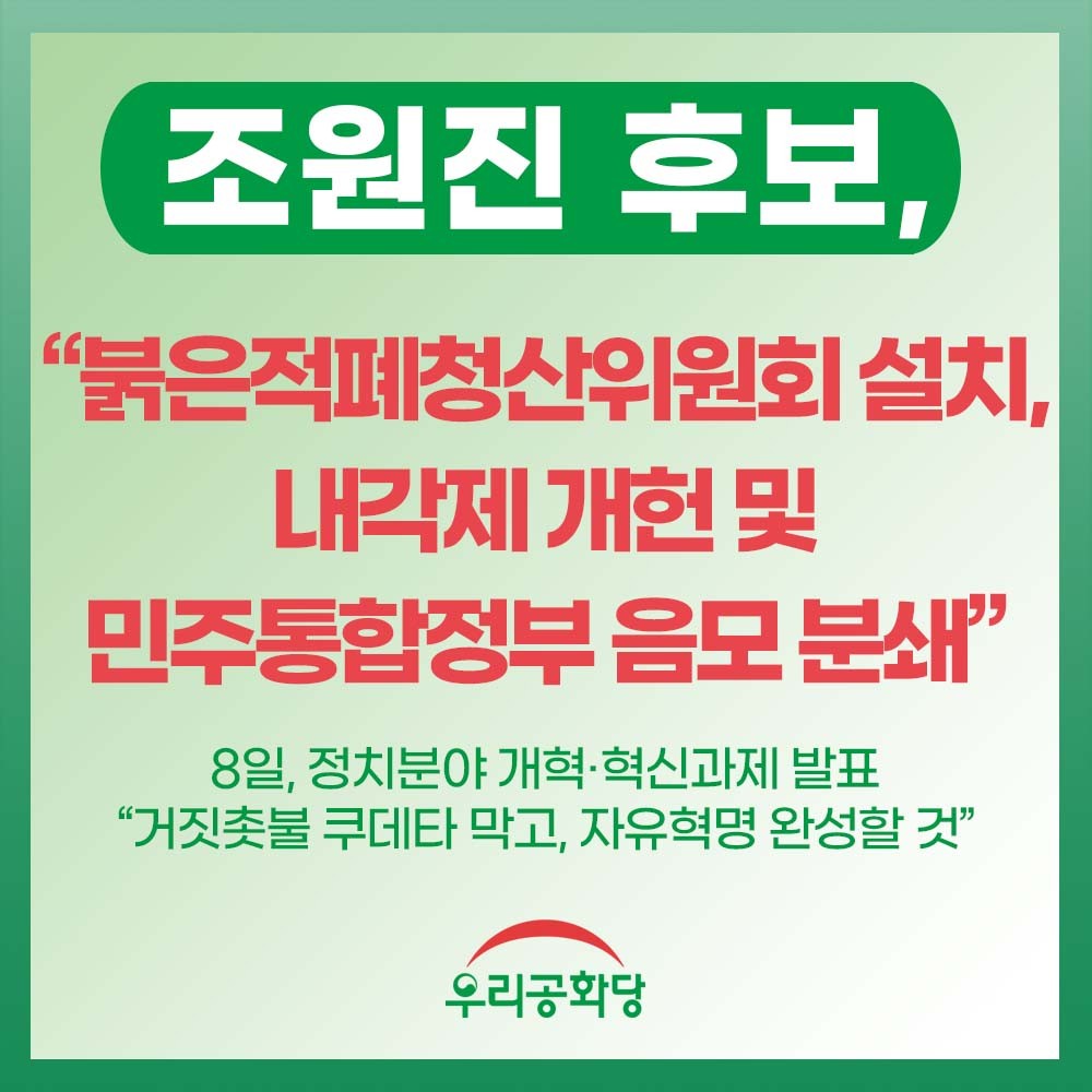 Á¶¿øÁø È帴 "±¹¹ÎÀÇÈûÀÌ ´õºÒ¾î¹ÎÁÖ´ç°ú ÇÏ·Á°í ÇÏ´Â ³»°¢Á¦ °³Çå ¹× ¹ÎÁÖÅëÇÕÁ¤ºÎ À½¸ð¸¦ ºÐ¼âÇÒ ¼¼·ÂÀº ÀÚÀ¯¿ìÆÄ ¼¼·ÂÀÎ ¿ì¸®°øÈ­´ç »ÓÀÌ´Ù"¸é¼­ "ÁÂÆÄ¼¼·ÂÀÇ °ÅÁþÃÐºÒ Äíµ¥Å¸ ¿Ï¼ºÀ» ¸·°í ÀÚÀ¯¿Í Á¤Àǰ¡ ´Ù½Ã »ì¾Æ³ª´Â ÀÚÀ¯Çõ¸íÀ» ¹Ýµå½Ã ¿Ï¼ºÇϰڴÙ"°í ¸»Çß´Ù. <³¡>