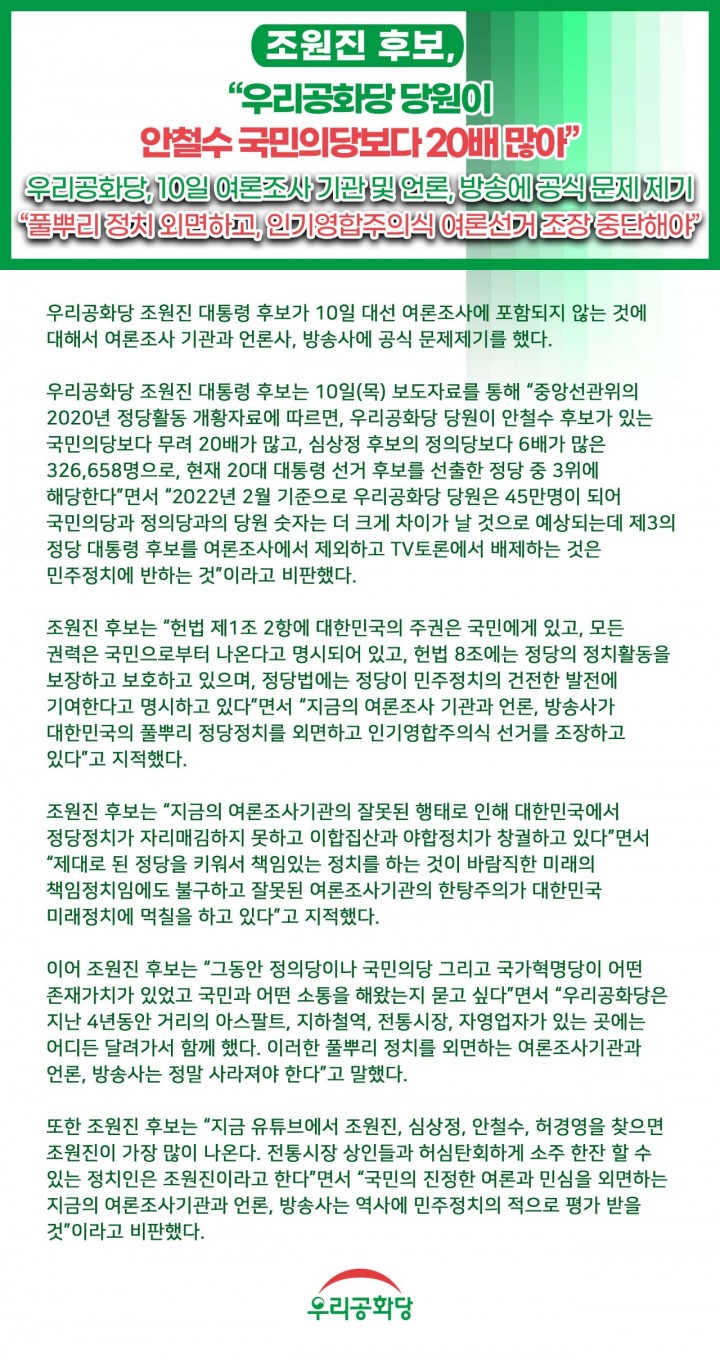 ¿ì¸®°øÈ­´ç Á¶¿øÁø ´ëÅë·É È帴 10ÀÏ(¸ñ) º¸µµÀڷḦ ÅëÇØ "Áß¾Ó¼±°üÀ§ÀÇ 2020³â Á¤´çȰµ¿ °³È²ÀÚ·á¿¡ µû¸£¸é, ¿ì¸®°øÈ­´ç ´ç¿øÀÌ ¾Èö¼ö È帰¡ ÀÖ´Â ±¹¹ÎÀǴ纸´Ù ¹«·Á 20¹è°¡ ¸¹°í, ½É»óÁ¤ Èĺ¸ÀÇ Á¤ÀǴ纸´Ù 6¹è°¡ ¸¹Àº 326,658¸íÀ¸·Î, ÇöÀç 20´ë ´ëÅë·É ¼±°Å È常¦ ¼±ÃâÇÑ Á¤´ç Áß 3À§¿¡ ÇØ´çÇÑ´Ù"¸é¼­ "2022³â 2¿ù ±âÁØÀ¸·Î ¿ì¸®°øÈ­´ç ´ç¿øÀº 45¸¸¸íÀÌ µÇ¾î ±¹¹ÎÀÇ´ç°ú Á¤ÀÇ´ç°úÀÇ ´ç¿ø ¼ýÀÚ´Â ´õ Å©°Ô Â÷À̰¡ ³¯ °ÍÀ¸·Î ¿¹»óµÇ´Âµ¥ Á¦3ÀÇ Á¤´ç ´ëÅë·É È常¦ ¿©·ÐÁ¶»ç¿¡¼­ Á¦¿ÜÇϰí TVÅä·Ð¿¡¼­ ¹èÁ¦ÇÏ´Â °ÍÀº ¹ÎÁÖÁ¤Ä¡¿¡ ¹ÝÇÏ´Â °Í"À̶ó°í ºñÆÇÇß´Ù.