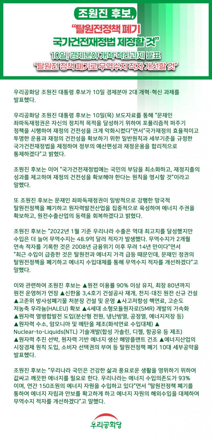 <º¸µµÀÚ·á> Á¶¿øÁø Èĺ¸, Å»¿øÀüÁ¤Ã¥ Æó±â, ±¹°¡°ÇÀüÀçÁ¤¹ý Á¦Á¤ÇÒ °Í, 10ÀÏ, °æÁ¦ºÐ¾ß °³Çõ¡¤Çõ½Å°úÁ¦ ¹ßÇ¥
