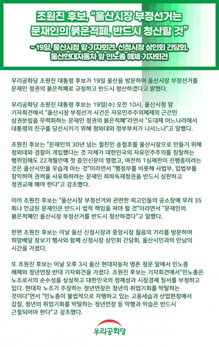 Á¦¸ñ : <º¸µµÀÚ·á> Á¶¿øÁø Èĺ¸, ¿ï»ê½ÃÀå ºÎÁ¤¼±°Å´Â ¹®ÀçÀÎÀÇ ºÓÀºÀûÆä, ¹Ýµå½Ã û»êÇÒ °Í